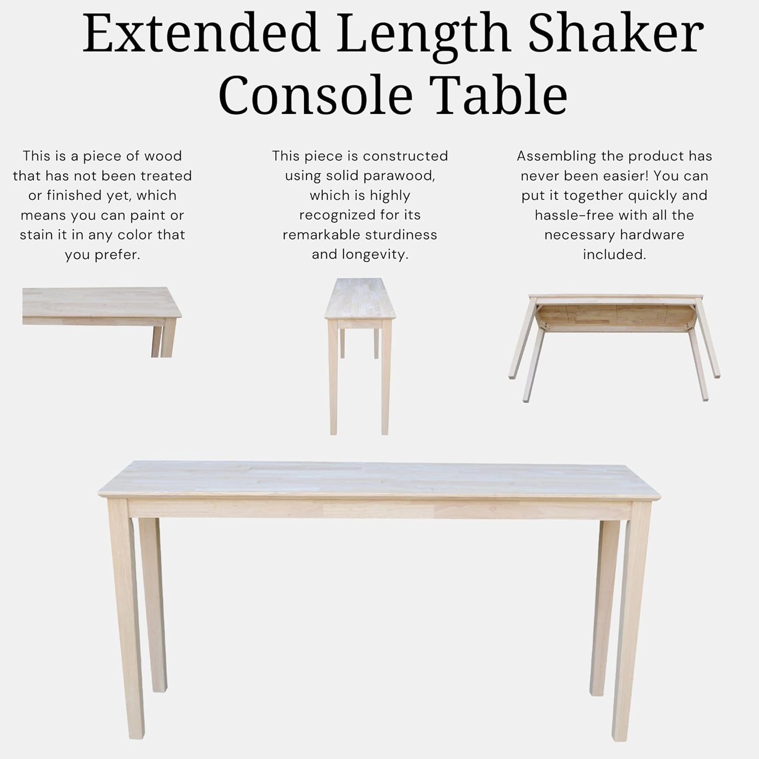 IC International Concepts Extended Length Shaker Console Table, 60" W x 16" D x 30" H Real/Solid Parawood, Kitchen/Dining, 50 Lbs. Wt. Capacity, DIY, Paint/Stain In Any Color, Unfinished