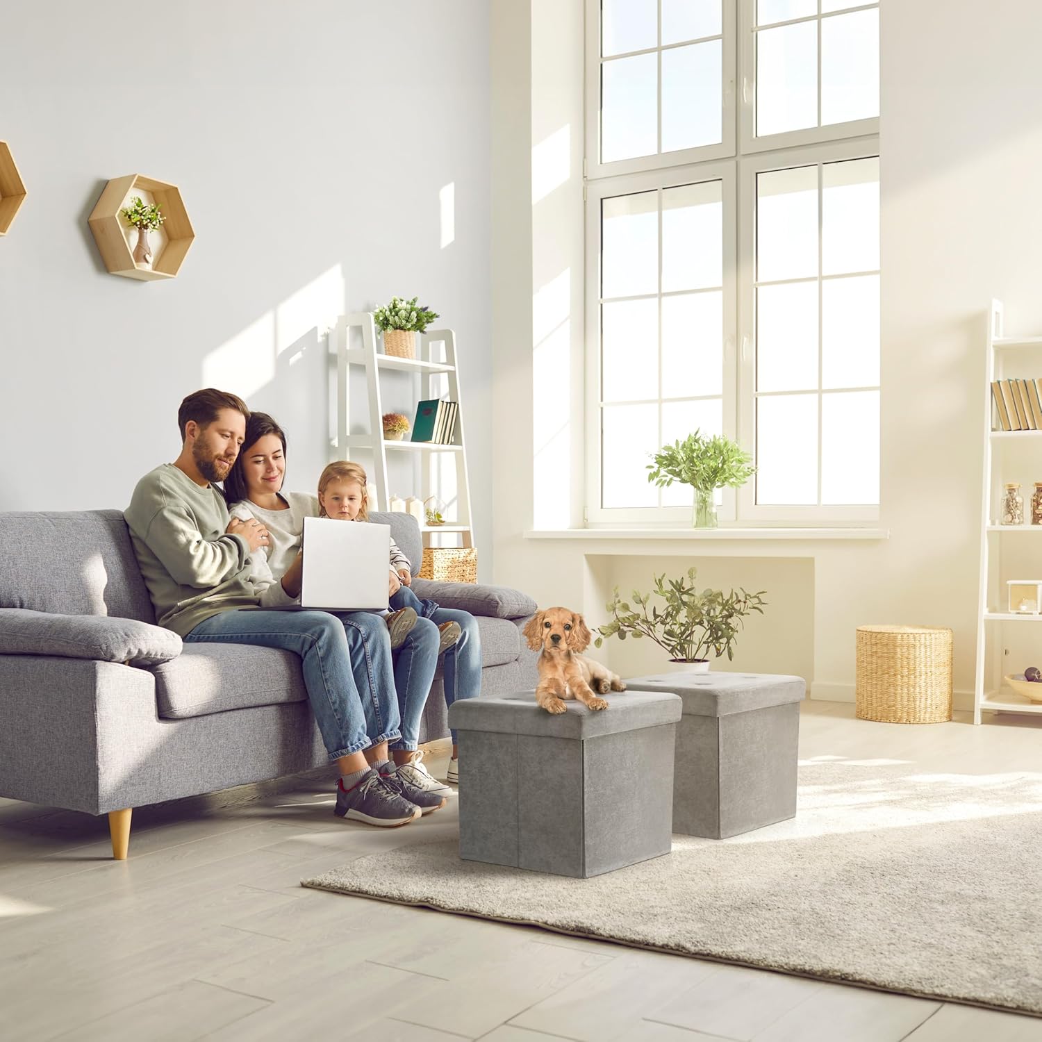 - STORAGE OTTOMAN CUBE (FAUX SUEDE, GRAY) — Add storage and seating with a beautiful cubed shaped folding ottoman — Tuck away clothing, linens, blankets, toys, and more to maximize your space with style and function