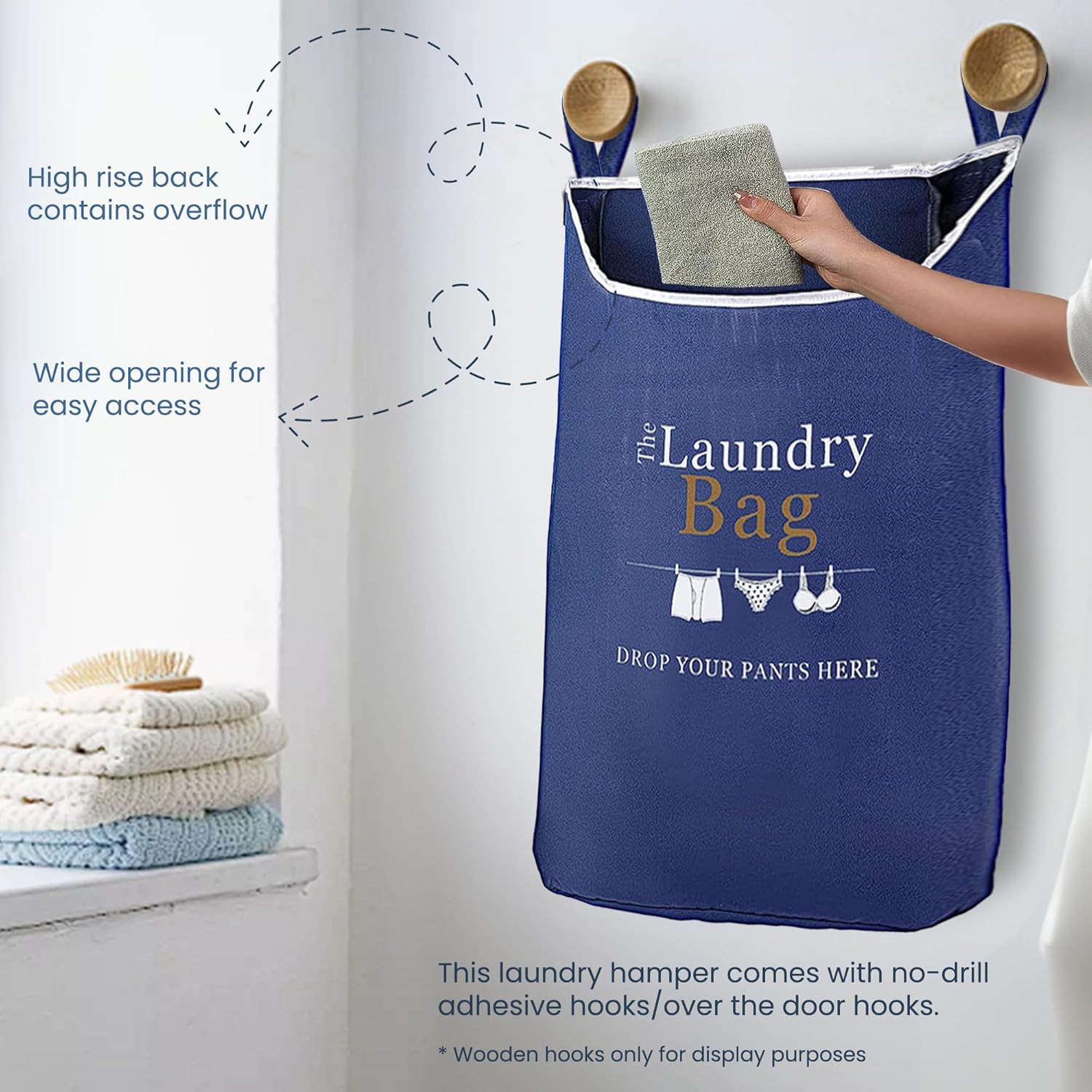 Fine Living Co. Large Hanging Laundry Hamper with Over Door Hooks & Adhesive, Durable Space Saving Laundry Bag with Zipper and Wide Open Top, Hanging Dorm Laundry Hamper (Navy Blue with Print-XL)