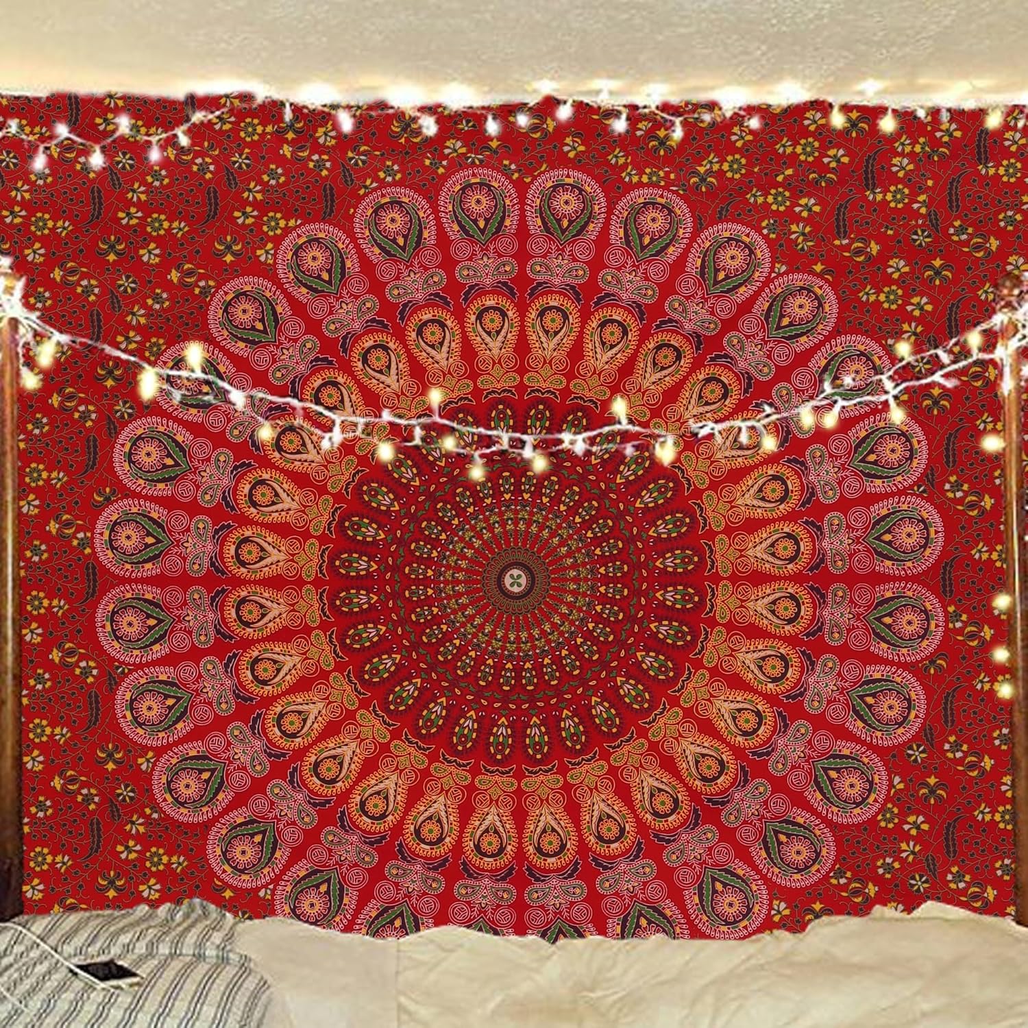 Bless International Handmade Indian hippie Bohemian Psychedelic Peacock Mandala Wall hanging College Dorm Beach Throws Table Cloth Bedding Tapestry (Golden Red, Twin(54x72Inches)(140x185cms))