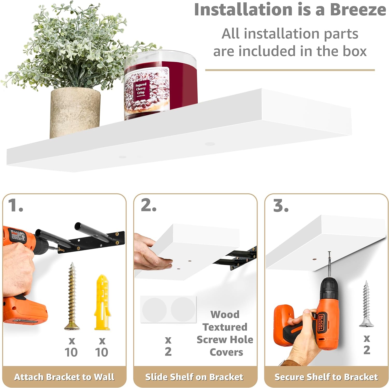 - Versatile & Functional Floating Wall Shelves: Install these floating shelves in the bedroom or bathroom to hold beauty/hair products - Place your wall shelf under a mirror in the entryway or exhibit family photos gallery style in a long hallway - Use as bathroom shelf, book shelf for wall, wall decor for bedroom, over the toilet shelf, kitchen floating shelves, floating nightstand, kitchen decor, living room wall decor, display shelf, and more