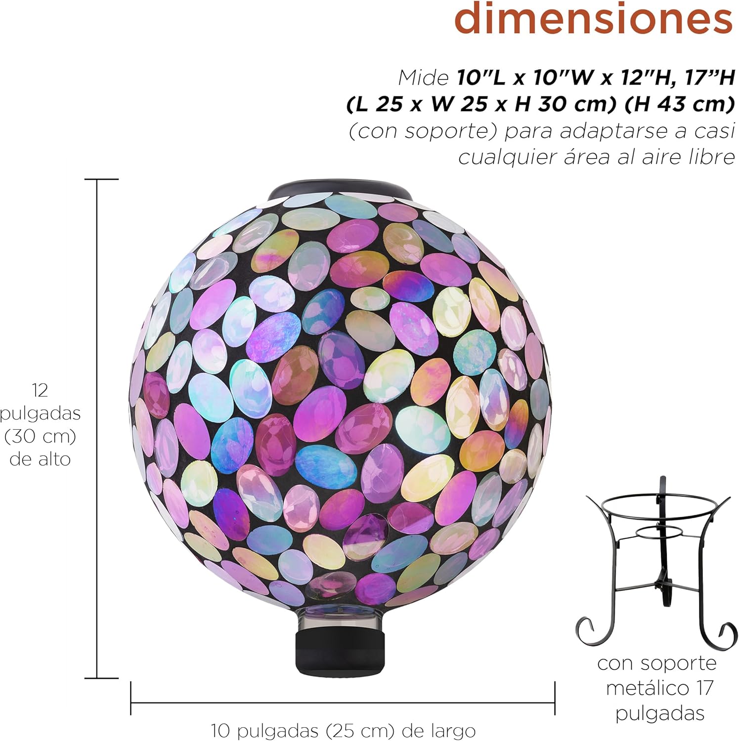- GAZING GLOBE YARD ART AND ONE YEAR Support: Measures 10"L x 10"W x 17"H (with stand) to fit almost any outdoor area and includes a one year manufacturer's Support from date of purchase