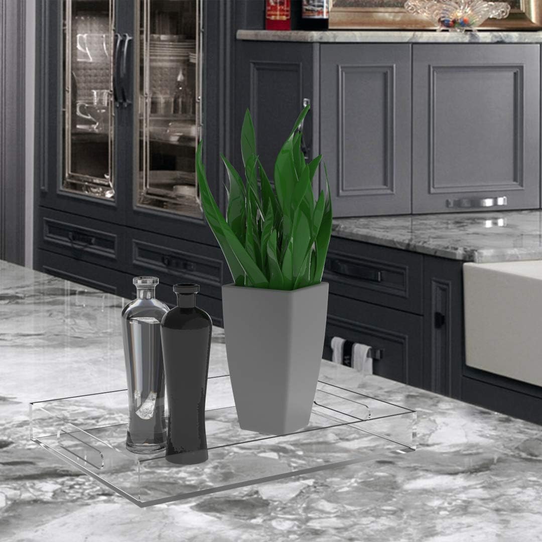 Clear Acrylic Serving Tray for Vanity, Bathroom, Outdoor, Food and Décor with Handles (Rectangle, Small)