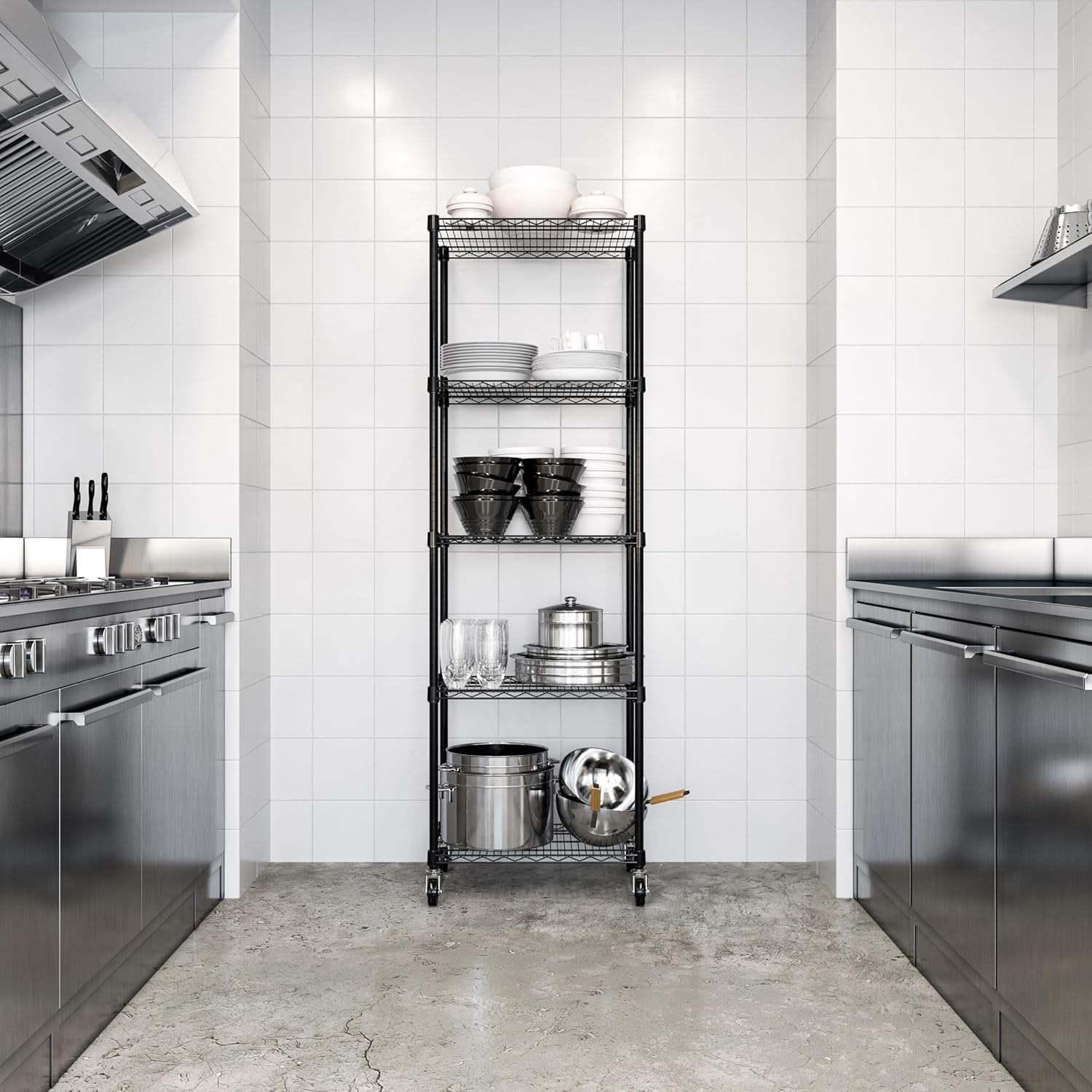 - 5 ADJUSTABLE SHELVES - 24" x 18" commercial-grade heavy-duty shelves are height adjustable at 1” increments.