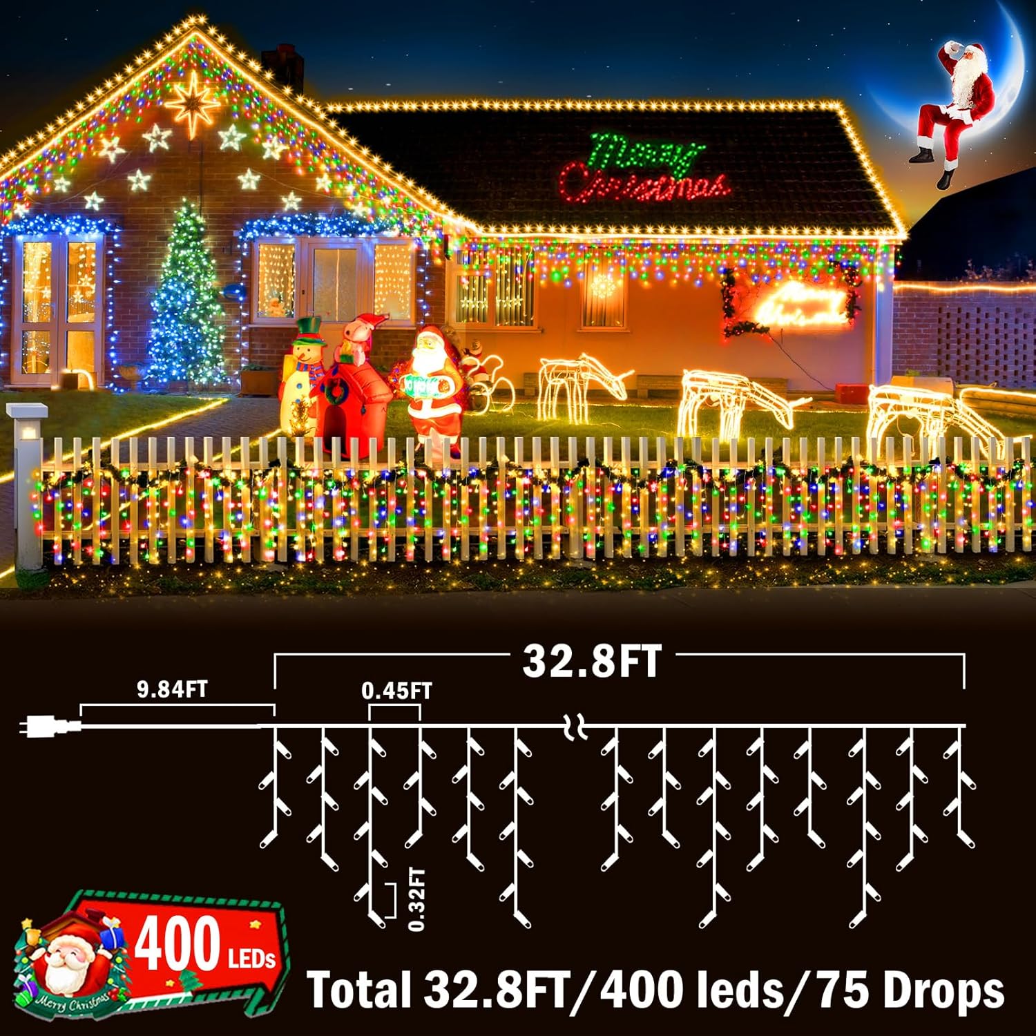 - 400 LED Christmas Lights: Total Length 43FT, string lights length is 33ft with 75 drops, 400 LEDs, and plug lead length is 9.84FT, which can be easily installed in the place where decoration is needed. Including UL588 Listed Plug, 1 steady on +7 Variable Lighting Modes, Connectable, and Timer & Memory Function. Whether decorating your Christmas house, New Year party,or Wedding, it will cast a funny and warm festive atmosphere. KNONEW lights must be your best choice for Christmas decorations.