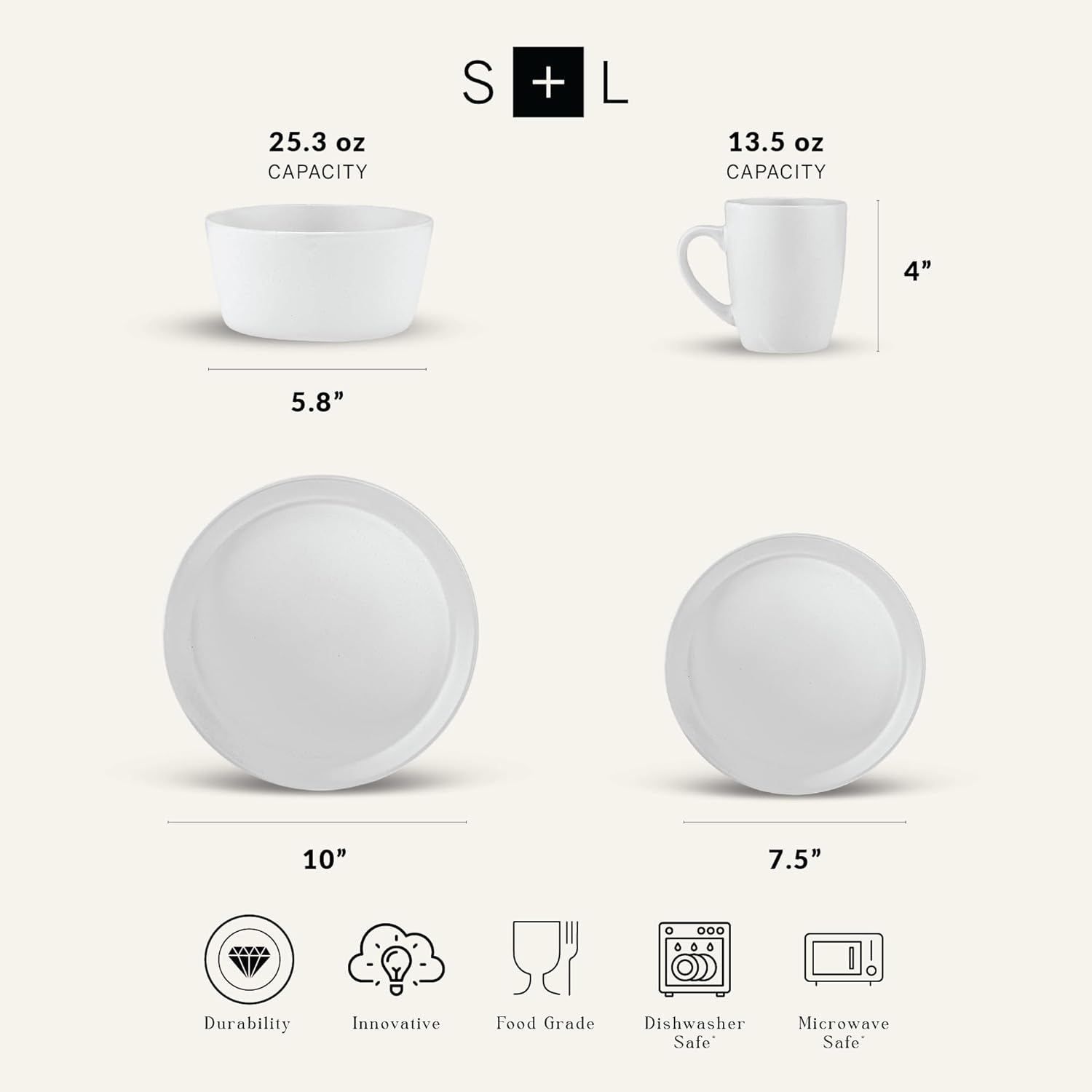 - 16-piece dinnerware service for 4 includes 10" dinner plates, 7.5" salad plates, 5.75" bowls, and 12.5 oz mugs—everything needed for casual dining or elevated hosting.