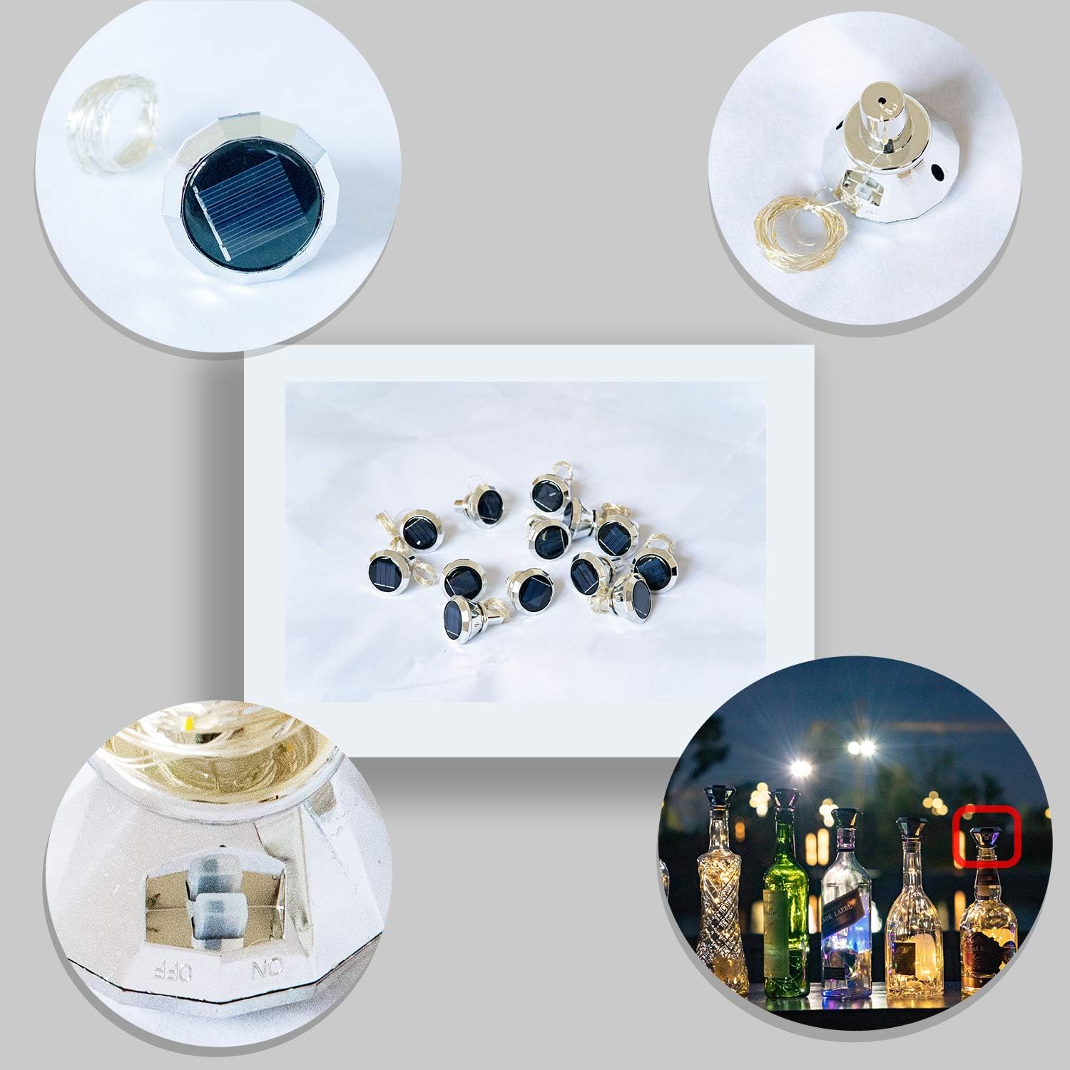- Easy To Use and Install -- Each bottle cork with an ON/OFF Switch. Our bottle lights are easy to fit into the top of the wine bottle. You don't have to drill a hole in the bottle. Just Simply Switch on the Lights and then insert in the bottles. A built-in light sensor ensure that it turns on at dusk and turn off by dawn automatically