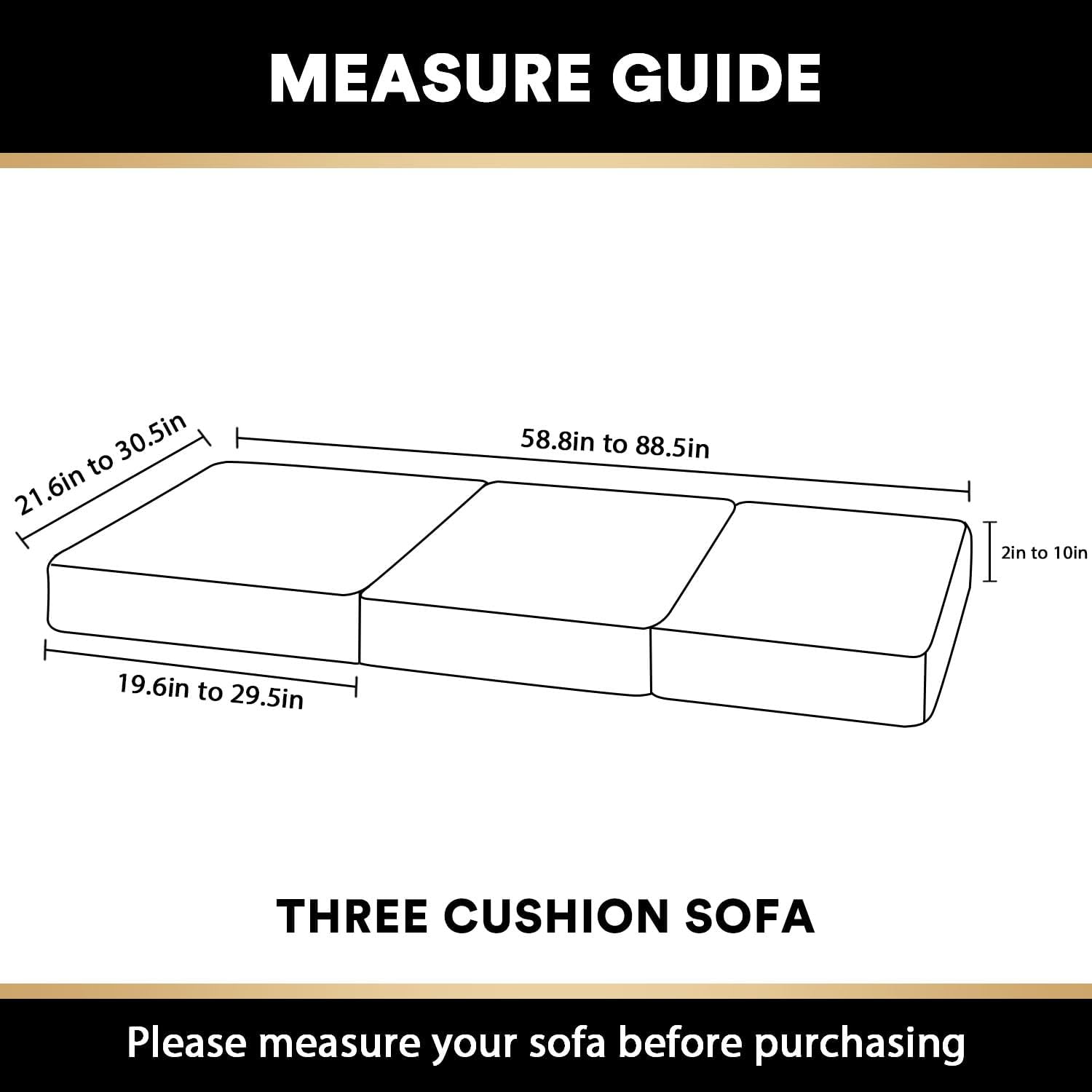 - GREAT FIT:3 piece seat cushion covers included. Each cushion cover measures: 19.6-29.5" length, 21.6-30.5" width and 2-10" thickness (height). PrinceDeco couch cushion covers are as close to custom as you can reasonably purchase. High recommended for both leather and cloth furniture.