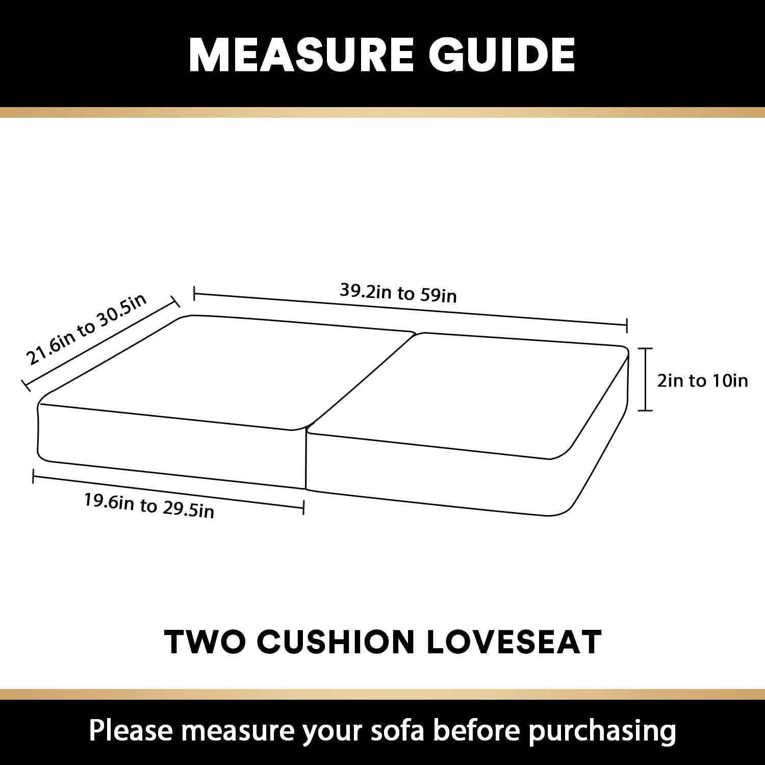 - GREAT FIT:2 piece seat cushion covers included. Each cushion cover measures: 19.6-29.5" length, 21.6-30.5" width and 2-10" thickness (height). PrinceDeco couch cushion covers are as close to custom as you can reasonably purchase. High recommended for both leather and cloth furniture.