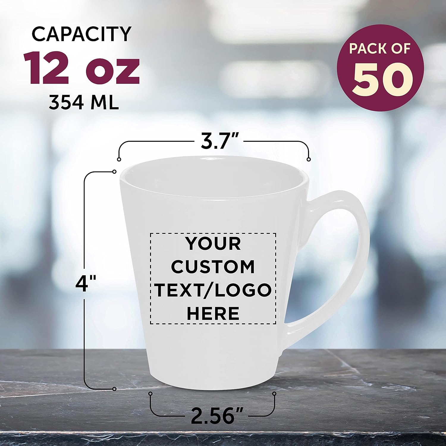 DISCOUNT PROMOS Custom Glossy Ceramic Latte Coffee Mug 12 oz. Set of 50, Personalized Bulk Pack - Perfect for Tea, Espresso, Cappuccino, Hot Cocoa - White