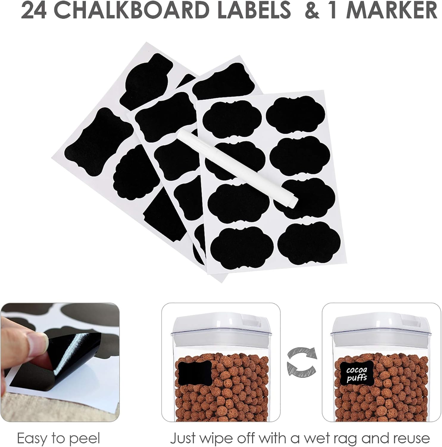 - 24 Reusable Labels----These labels will help you never confuse flour with powdered sugar or baking powder with baking soda. They are reusable, you can switch contents whenever you need.