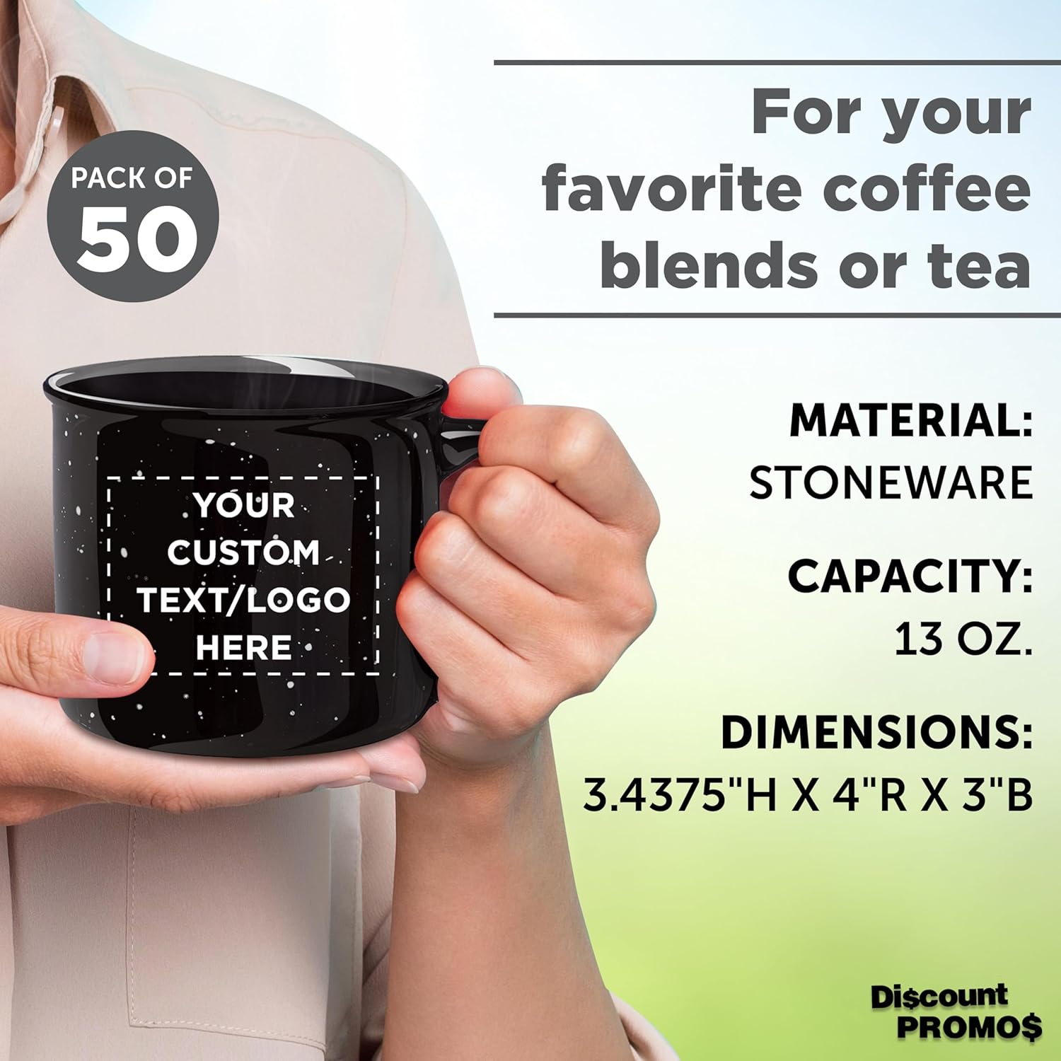 DISCOUNT PROMOS Custom Ceramic Campfire Coffee Mugs 13 oz. Set of 50, Personalized Bulk Pack - Perfect for Tea, Espresso, Cappuccino, Hot Cocoa - Black