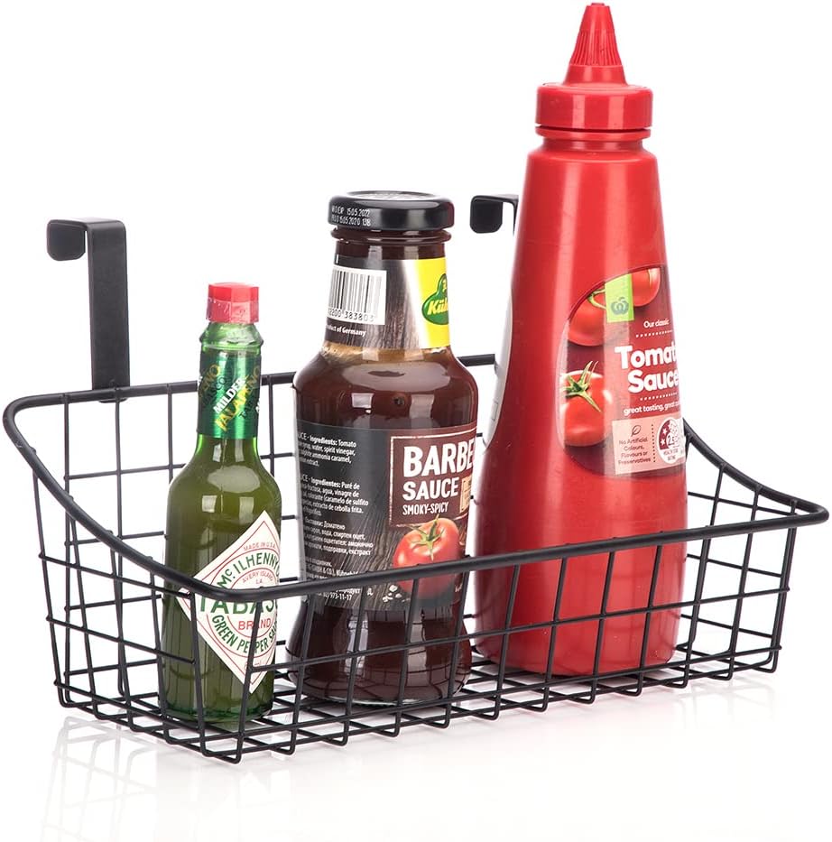 - UTILIZE DEAD SPACE: Add extra storage without all the hardware. Use these storage bins to organize your pantry, kitchen, bathroom, office, craft room, entryway, or closet. Sturdy steel basket and dependable brackets support a variety of items without bending or buckling,over cabinet door organizer.