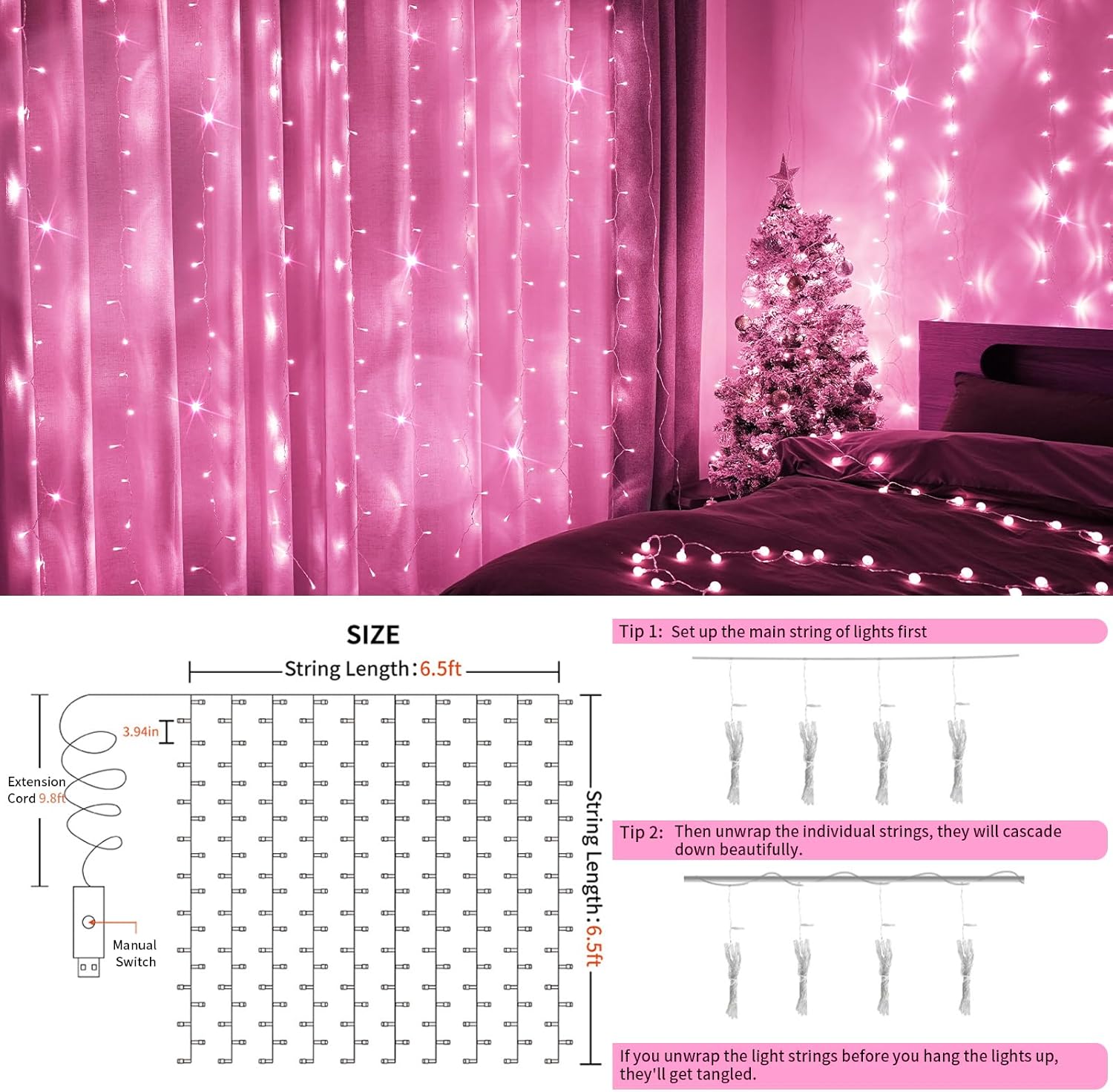 - [PINK CURTAIN LIGHTS] Hang the pink curtain lights to create a joyful cute bedroom. Pink fairy lights will be the optimum choice for introducing romance, cute and cozy to girls bedroom. Besides, a date night with pink string lights will be an unforgetable night. Choose pink lights for any romantic, cute, joyful scheme.