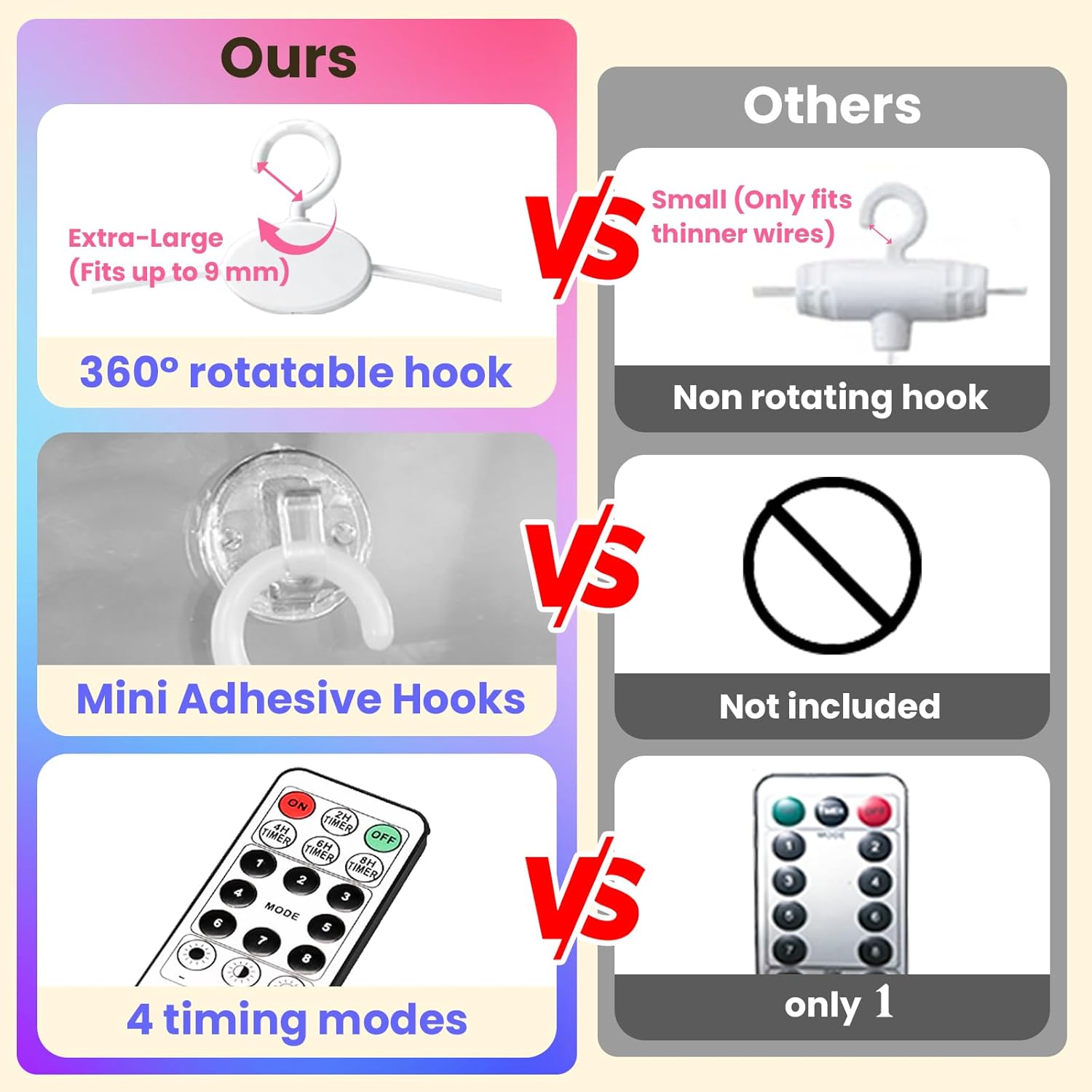 - 360°Rotatable Hooks: Upgrade 360°Rotation Clips on each drop string is mainly used for hooking on curtains; It can be hung at any angle, such as on wall, window or other surface; Also includes 16 sets of Damage-free adhesive hooks; No nails needed and holds strongly and removes cleanly; Both of these two clips make the curtain light easily to be hung for some special places, not only limited to windows, but also can be hung on flat walls, glass, porches, eaves, etc