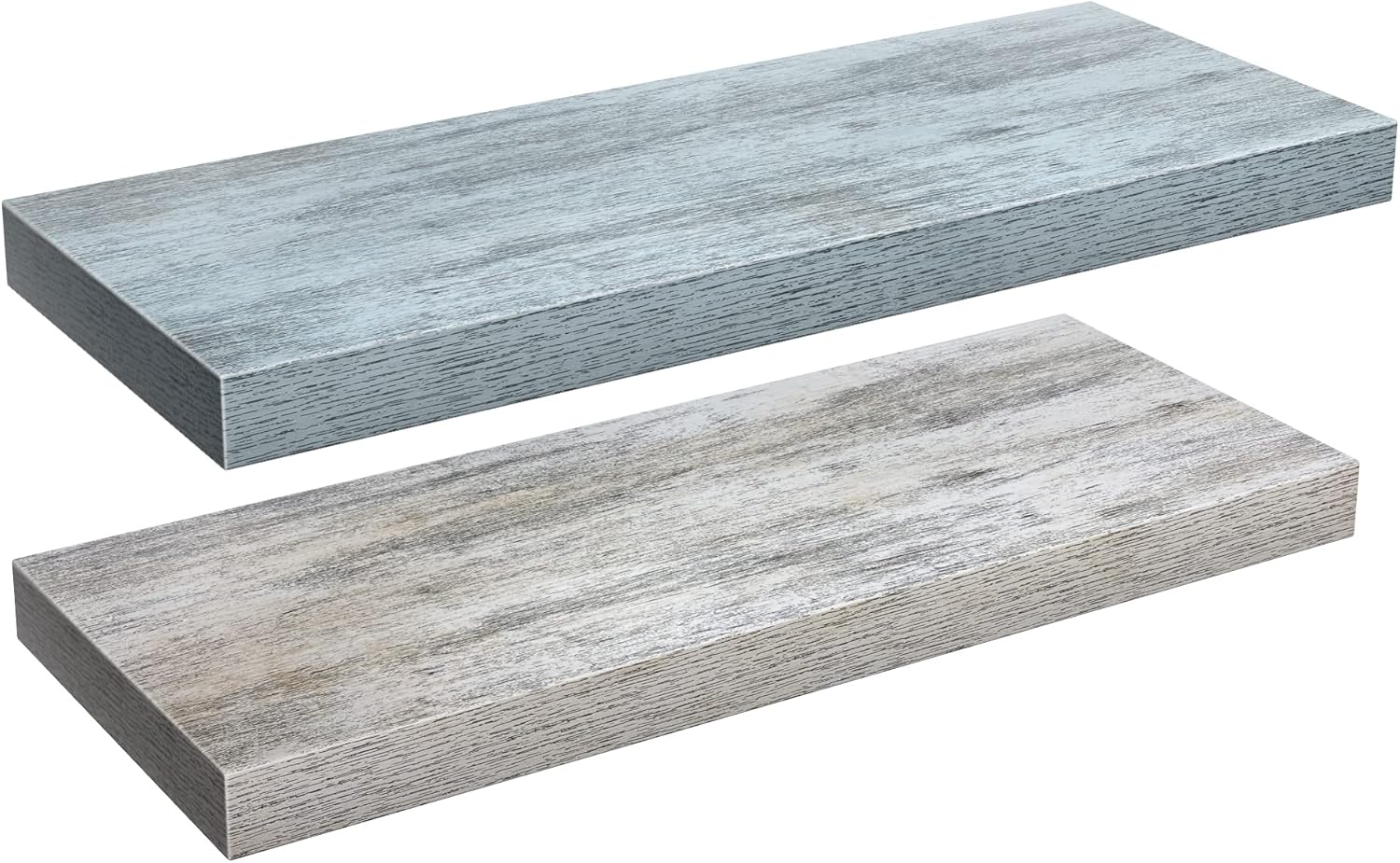 - Rustic Blue White Floating Shelves for Wall Storage: 2 Pack 24 X 9 Inch Floating Shelves - Display charming showpieces for beach decor, coastal decor or home decor items, and other prized possessions while offering functional wall bookshelf, book shelf or bathroom shelf storage. Our beach bathroom decor shelf Measures approximately 24" L X 9" W 1.50" thick - The shelf colors might be a bit different from the pictures due to the different lighting and screen settings