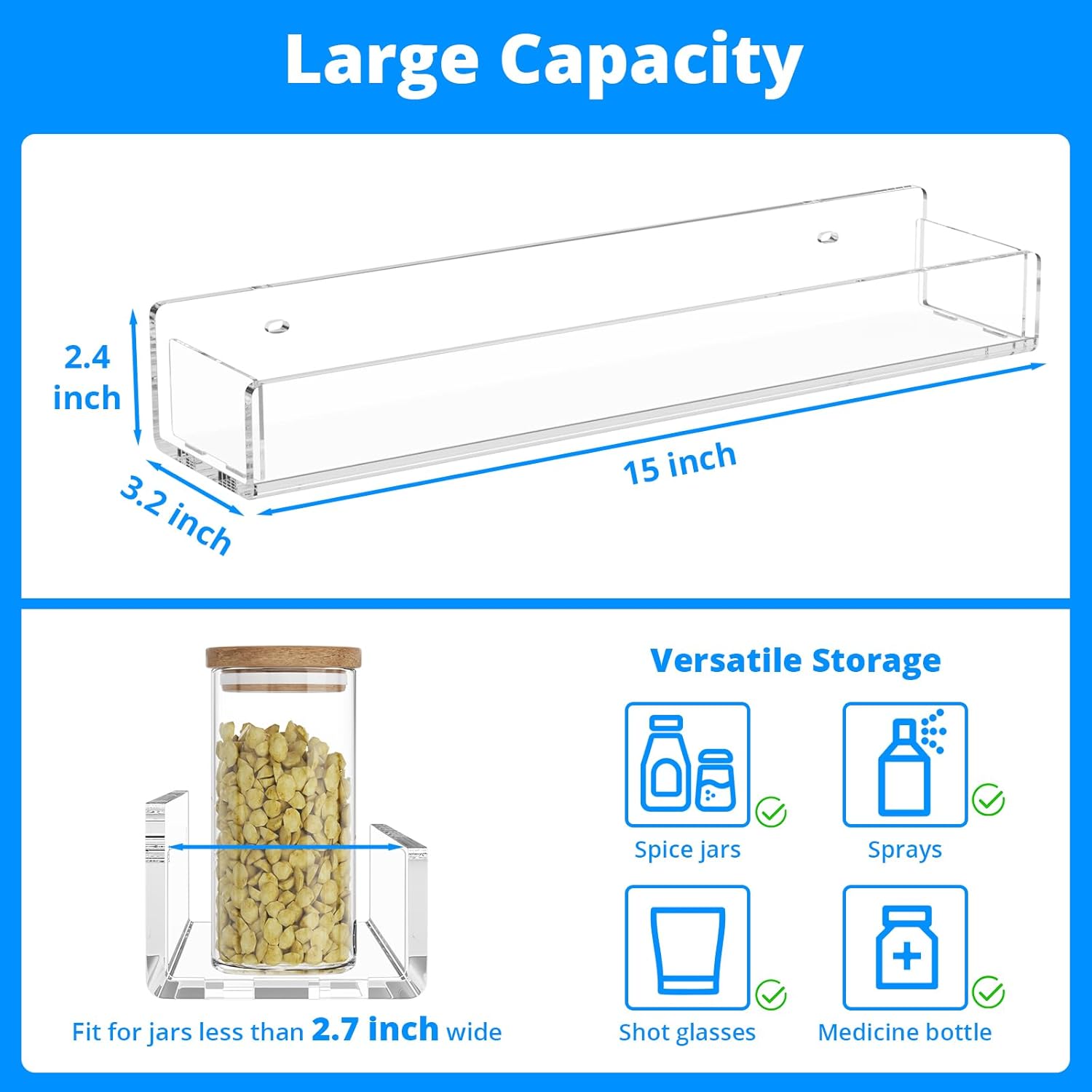 - WALL MOUNTED SPICE RACK - The unique design is just to make your home more tidy, and the transparent material allows you to easily get the spices you need, so as to get rid of looking for the condiments you want on the chaotic tabletop, saving you time in making food. The added baffle on the side can keep your spices on the shelf more safely. Warm Tips:Does not contain jars.