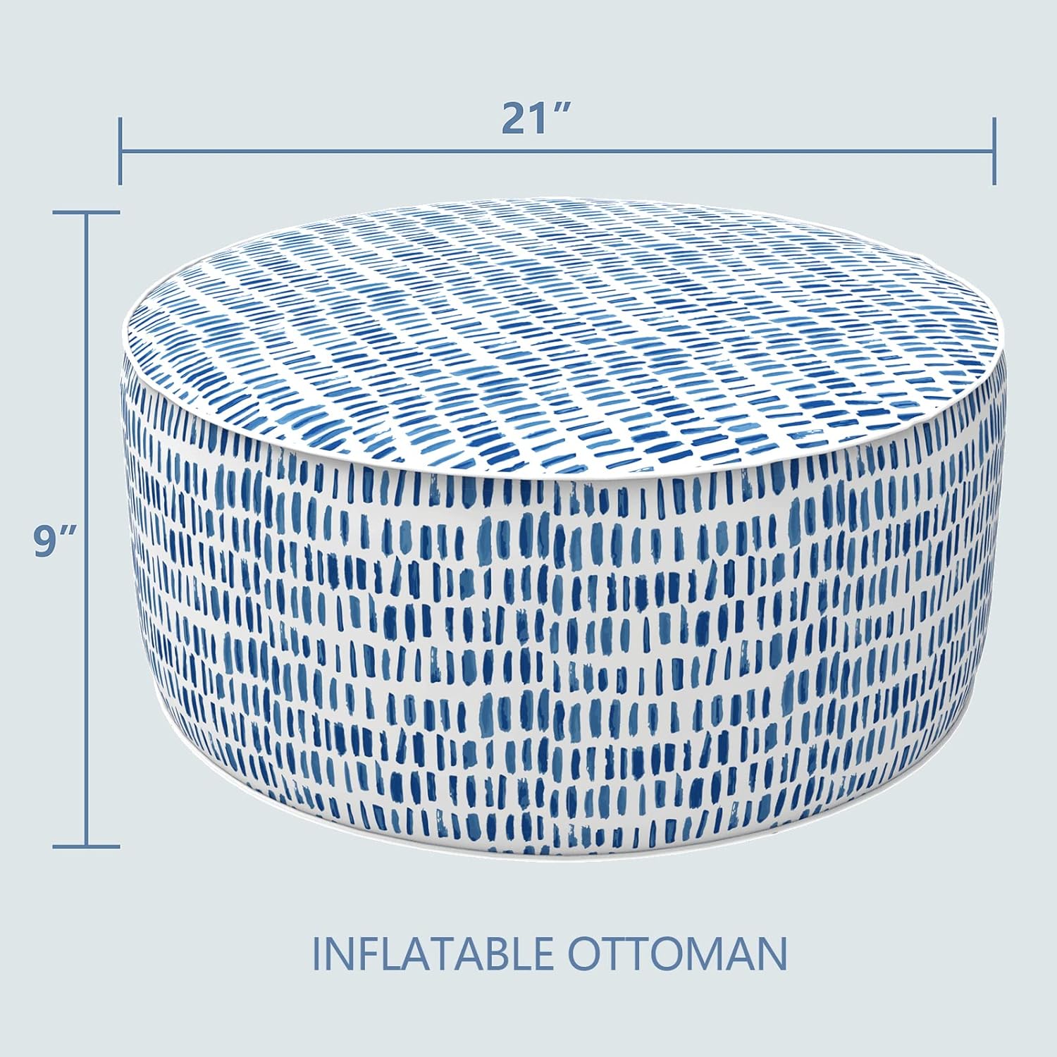 - COMPONENTS: This value bundle come with 1 pcs indoor outdoor inflatable ottoman measures D21” x W21" x H9” (53 x 53 x 23cm). Made of durable and soft polyester fabric, sturdy inflatable PVC liners. INFLATOR IS NOT INCLUDED.