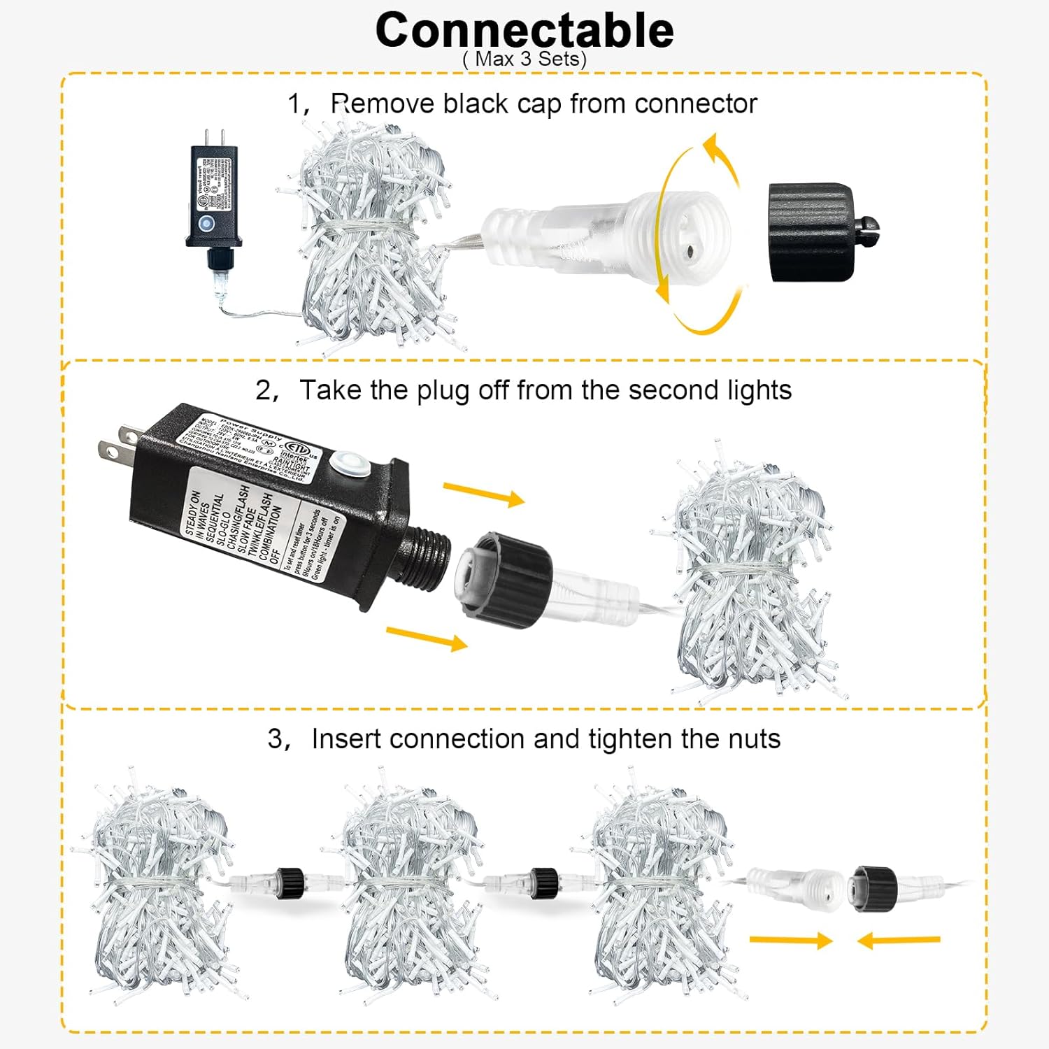 - Low Voltage & UL Certification: The output voltage of the led icicle Christmas lights outdoor is 29V, the power of adapter is 6W with UL certified, energy saving and safe to use. The twinkle lights will not overheat even after working for a long time and safe to touch.