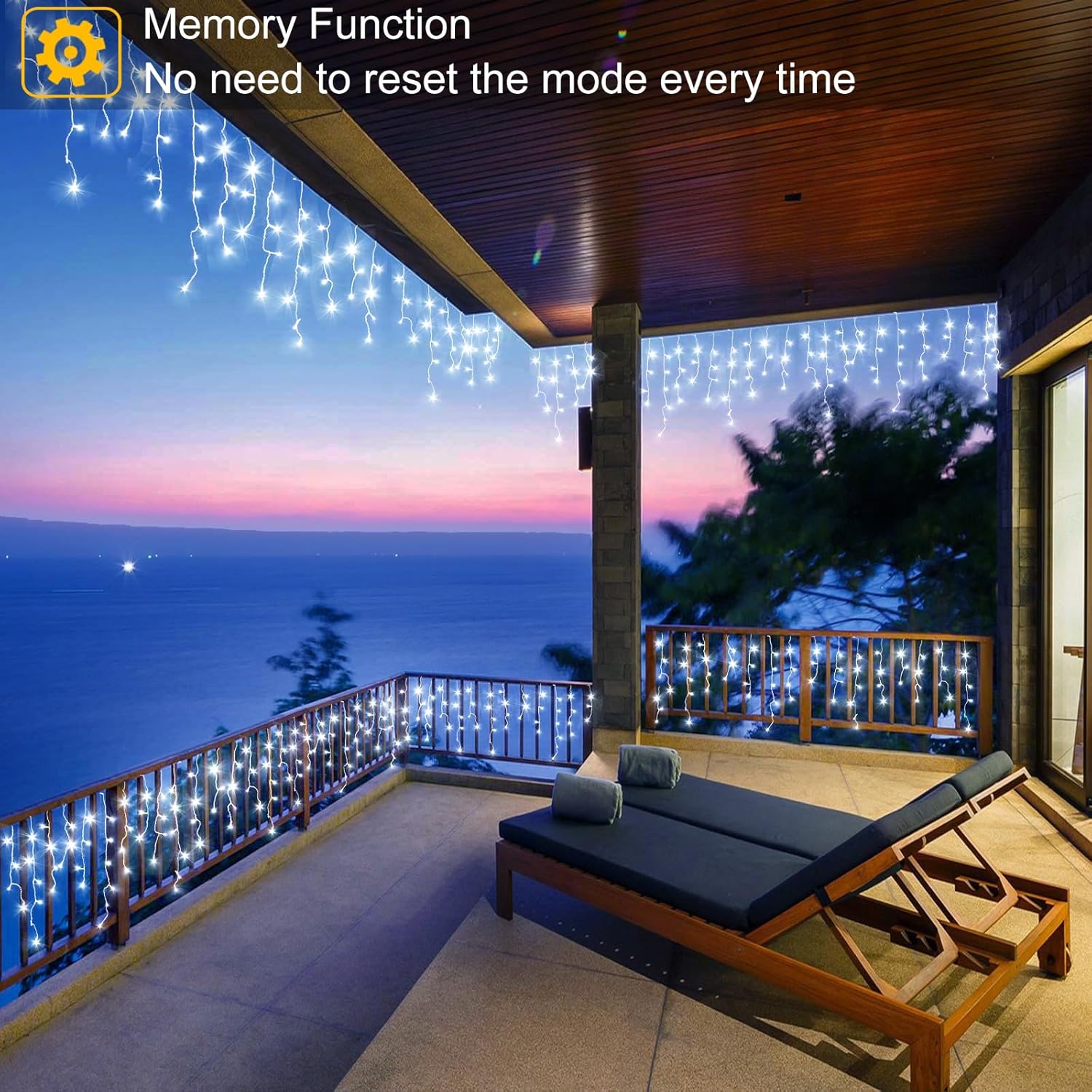 - Upgraded 8 Modes Icicle Lights for Outside: The Christmas Lights outdoor have 8 selections of light pattern: 1.Combination 2.In Waves 3.Sequential 4.Slo-Glo 5.Chasing/Flash 6.Slow Fade 7.Twinkle/Flash 8.Steady On. Different lighting effects are controlled by the button on the plug. These beautiful and vibrant white Christmas lights will bring you a lot of festive atmosphere.