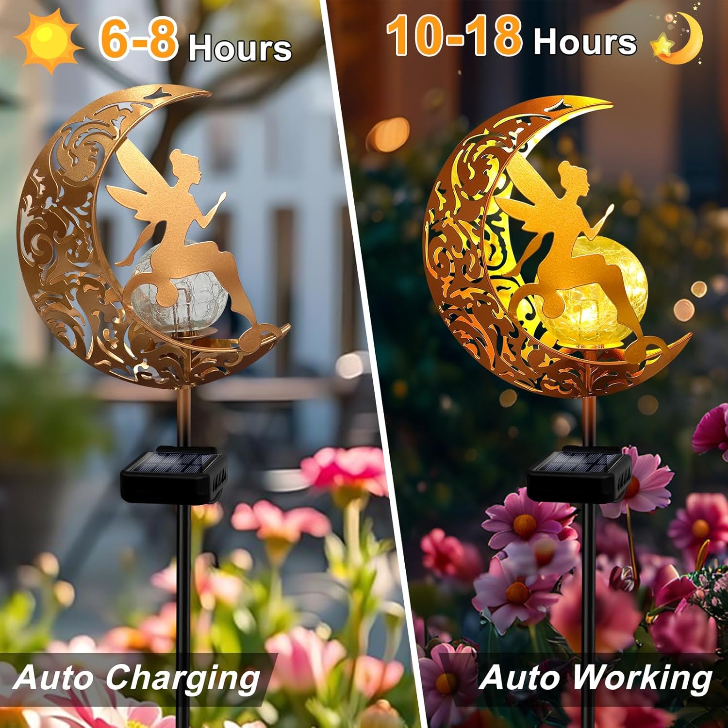 - 【Easy Installation & IP 65 waterproof】: Crafted from high-quality metal materials, this solar garden decor lights is IP65 waterproof and rust-proof, ensuring durability and longevity. Designed for hassle-free use, it requires no complex assembly, allowing you to place it anywhere to enhance your outdoor decor. Create your dream garden ambiance with our Fairy Moon Figurine Light Stake.