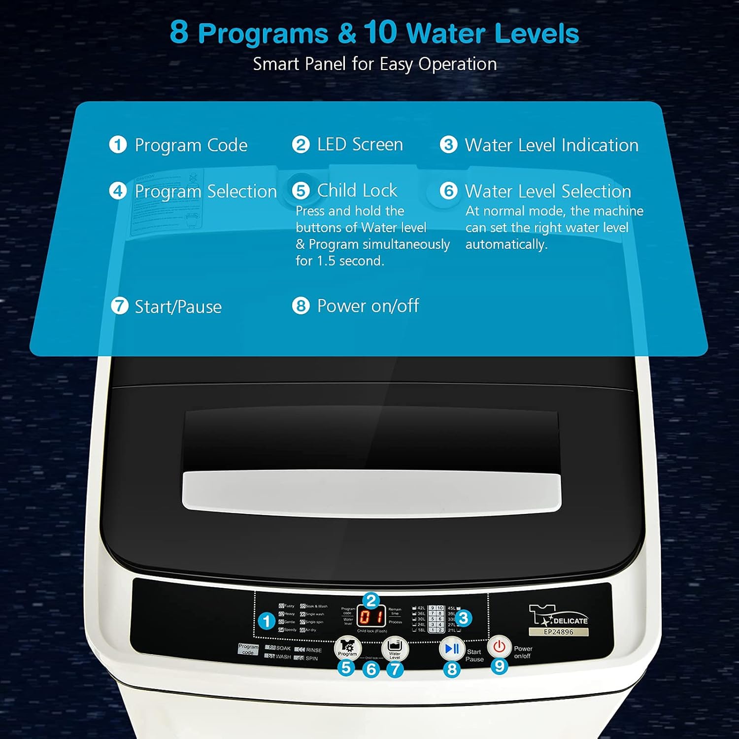 - [8 Programs & 10 Water Levels]: The high-performance washing machine provides you with 8 different choices to treat your clothes accordingly. And the wide range of 10 water levels will meet the needs based on your laundry load. With this multi-functional washing machine, you will get a tailor-made service for more convenience.