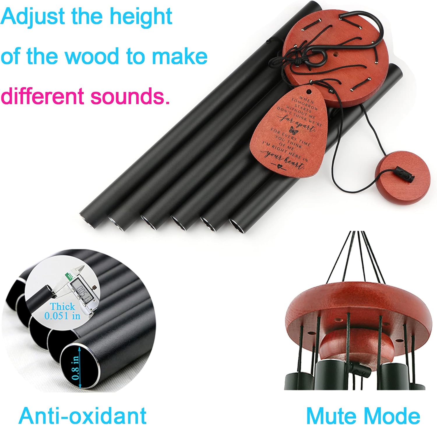 - Premium Quality Memorial Wind Chimes: Made with high-quality aluminum tubes and a corrosion-resistant black anodized finish, these memorial wind chimes produce clear, beautiful tones. The bell holder, striker, and wind catcher are made from durable beech wood, and the entire structure is supported by a strong, weather-resistant nylon cord for lasting outdoor use