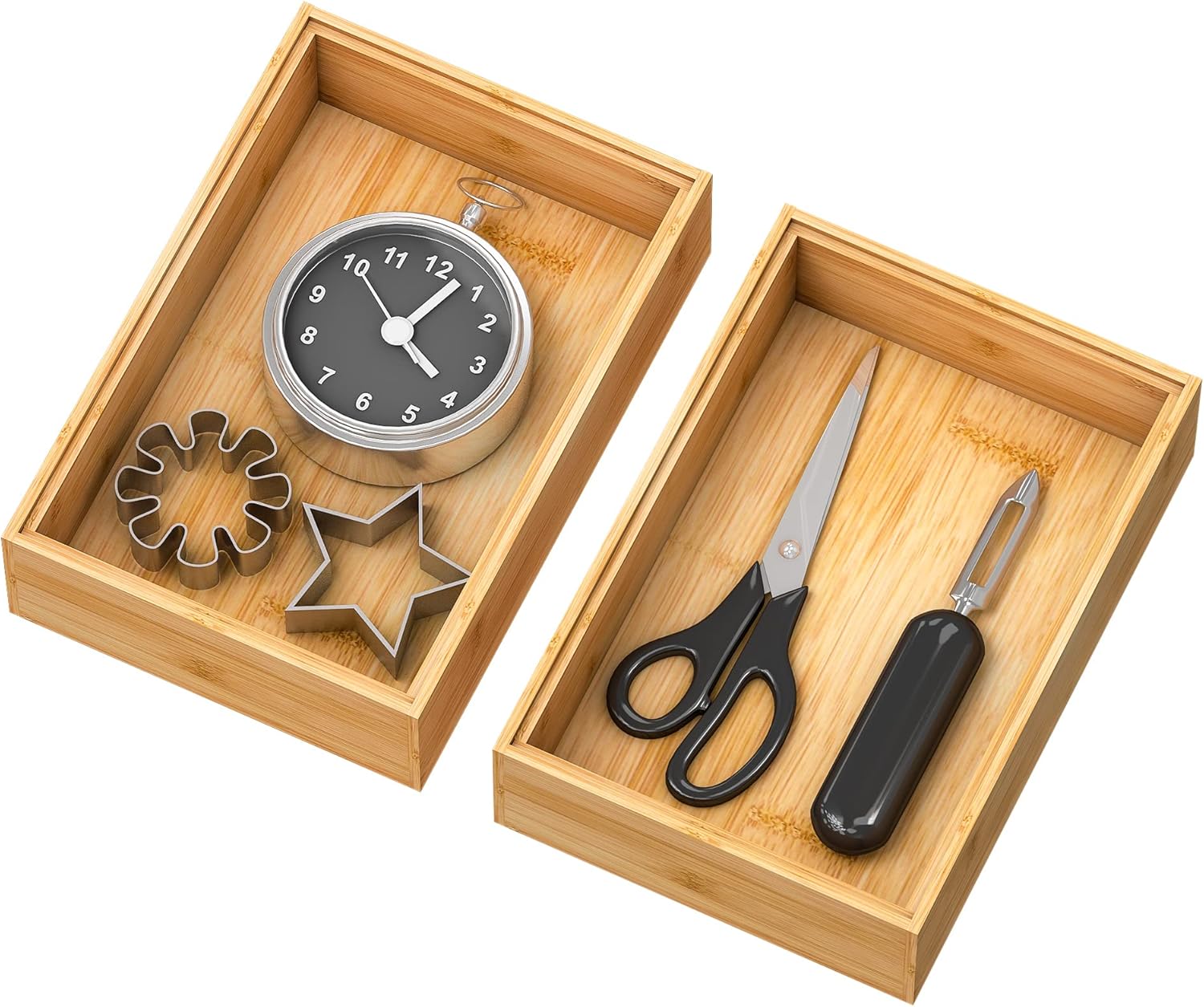 - 【2-Piece Bamboo Drawer Organizer Set】 An ideal deep drawer organizer for multi-purpose Use. As a kitchen drawer to organize silverware, utensil, cutlery, flatware, spoons, spatulas, whisks, wine stoppers, bottle openers etc; as a dresser drawer to organize makeup like lipstick, eyeliner, mascara, makeup brushes and more or as a desk drawer to keep pens, paper clips, staples and other supplies organized.Make eachwhere more neater.