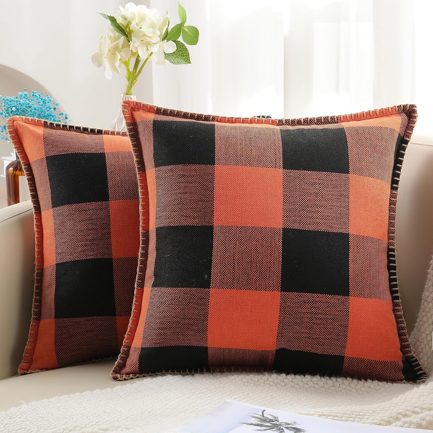 decorUhome Fall Orange and Black Decorative Throw Pillow Covers 18x18 Set of 2, Buffalo Plaid Check Farmhouse Cushion Covers with Stitched Edge for Autumn Harvest Couch Sofa Bed Home Decor
