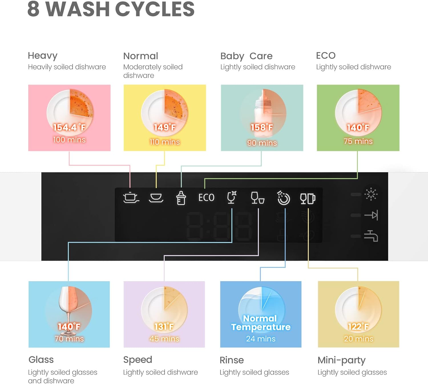 - 8 Washing Cycles- Most of the cleaning cycles, including Heavy, Normal, Baby-Care, ECO, Glass, and Speed, helped with extra-drying function, and deliver sparklingly cleaned and dried dishes. Three more cleaning options, including Speed, Mini-party, and Rinse, are designed for COMFEE' compact dishwasher, providing high flexibility for you to choose in different situations.