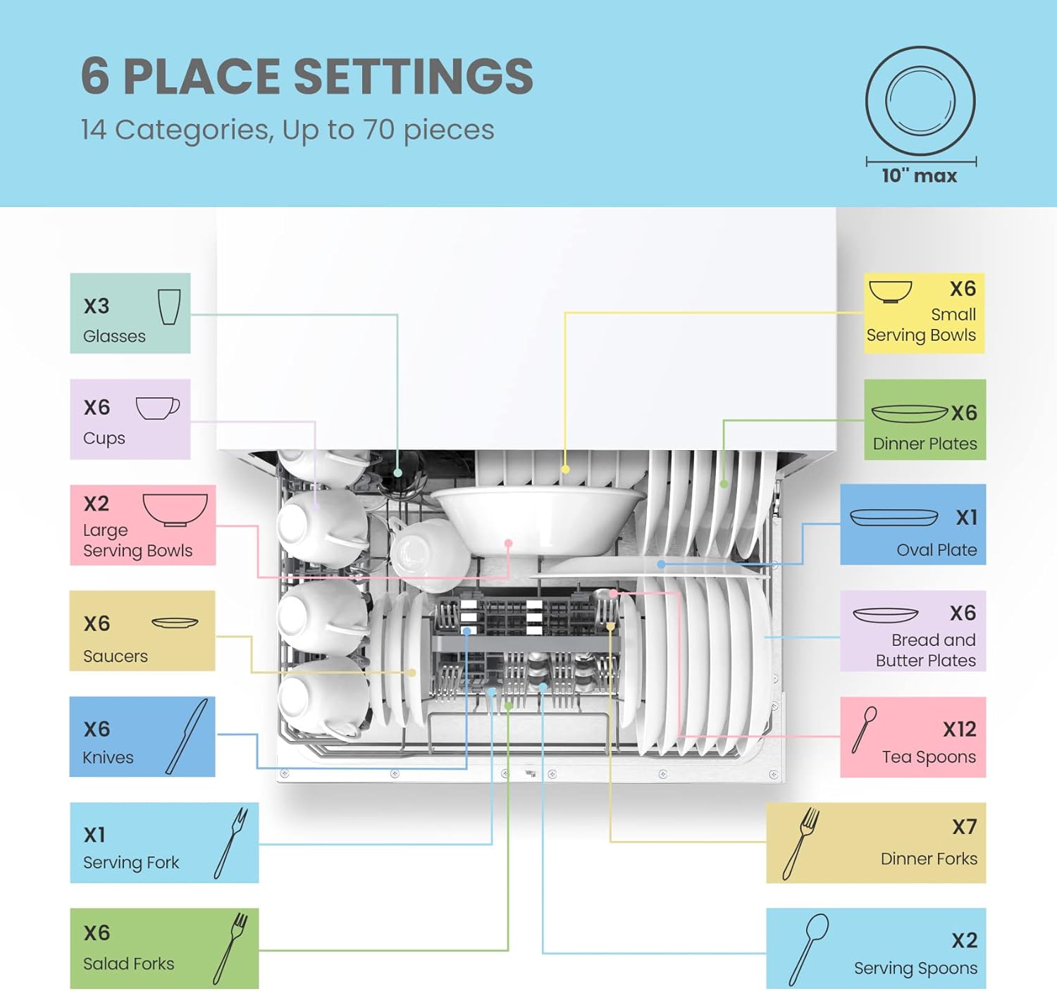 - 6 Place Setting- A perfect size (H17.2″×W21.6″×D19.7″) for 2-3 people, COMFEE’ compact dishwasher is suitable for dorms, RVs, and apartments. This countertop dishwasher can fit up to 70 pieces of tableware and has a plate size of up to 10 inches in diameter. Note: COMFEE dishwashers are tested at the factory before they are shipped. If your new dishwasher has some water inside, this is normal.