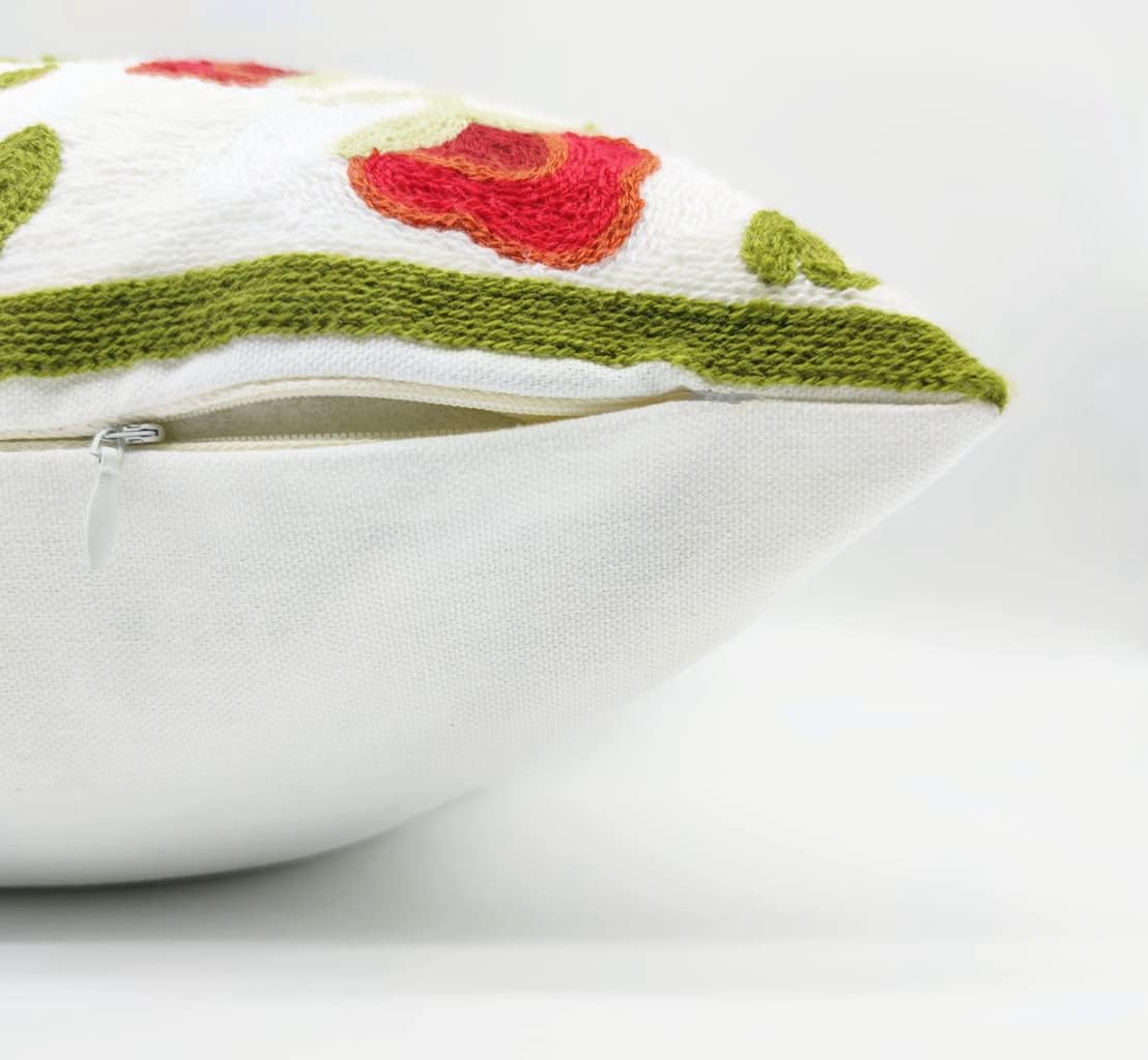 Alysheer Floral Embroidered Summer Decorative Throw Pillow Cover 18"x 18", Farmhouse Cottage Red Flowers Green Leaves Knit Pattern Cotton Canvas Cushion Case for Sofa Couch Bed Living Room Decor