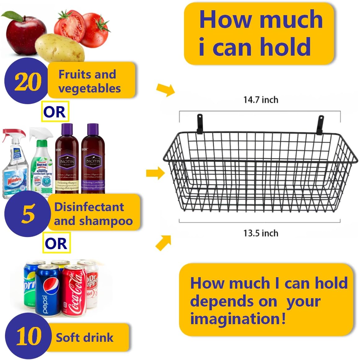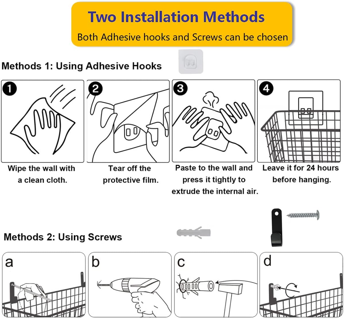 - ๐ใSturdy wire baskets that can hold 50 poundsใ These baskets are made of durable steel wire with durable anti-rust and anti-corrosion coating, as well as wall-mounted hardware and hooks, which can hold 50 pounds. (Note: If you use non-marking paste instead of screws, the basket can hold 11 pounds)