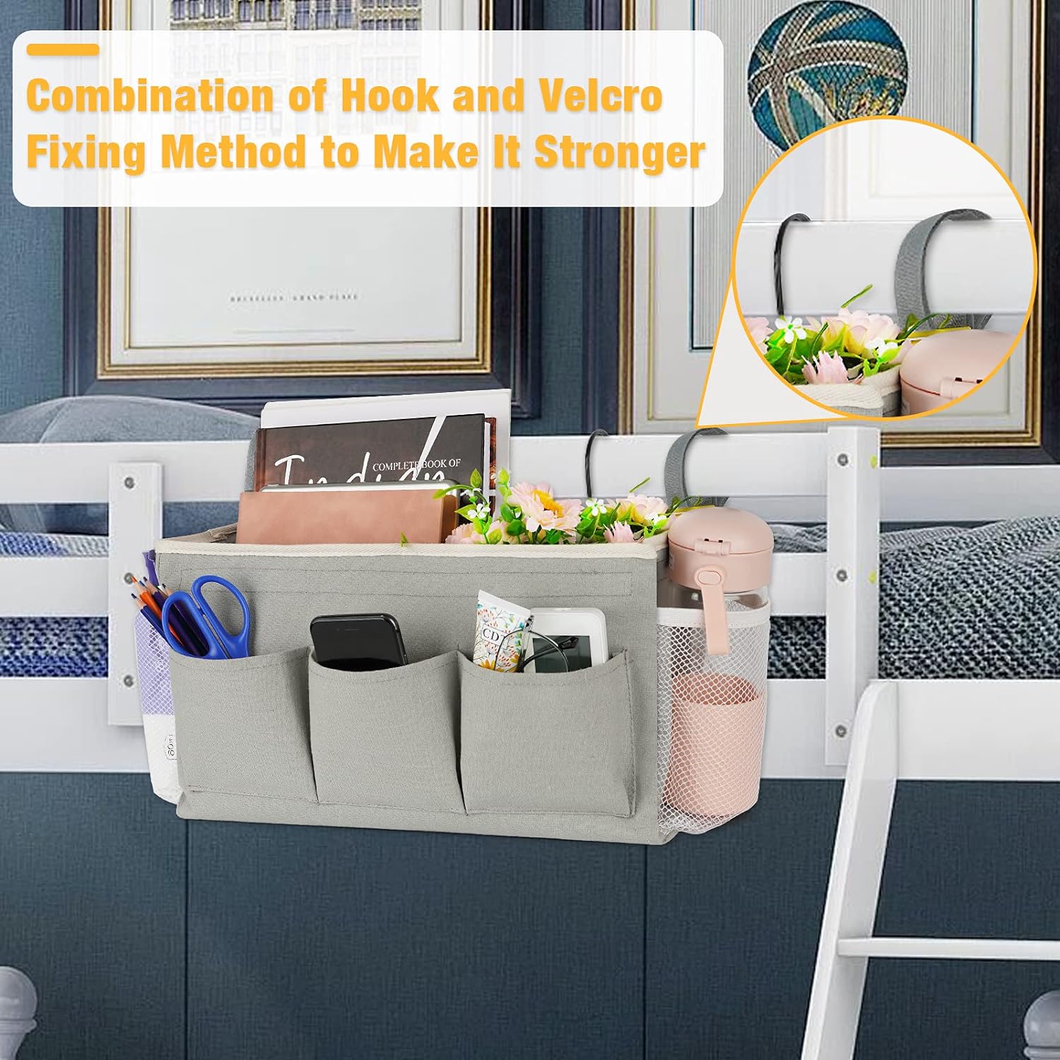 Bedside Storage Organizer with Fixed Straps and Water Bottle Holder for Home, College, Dorm, Bunk / Hospital Bed, Crib Bed Rails (Grey)