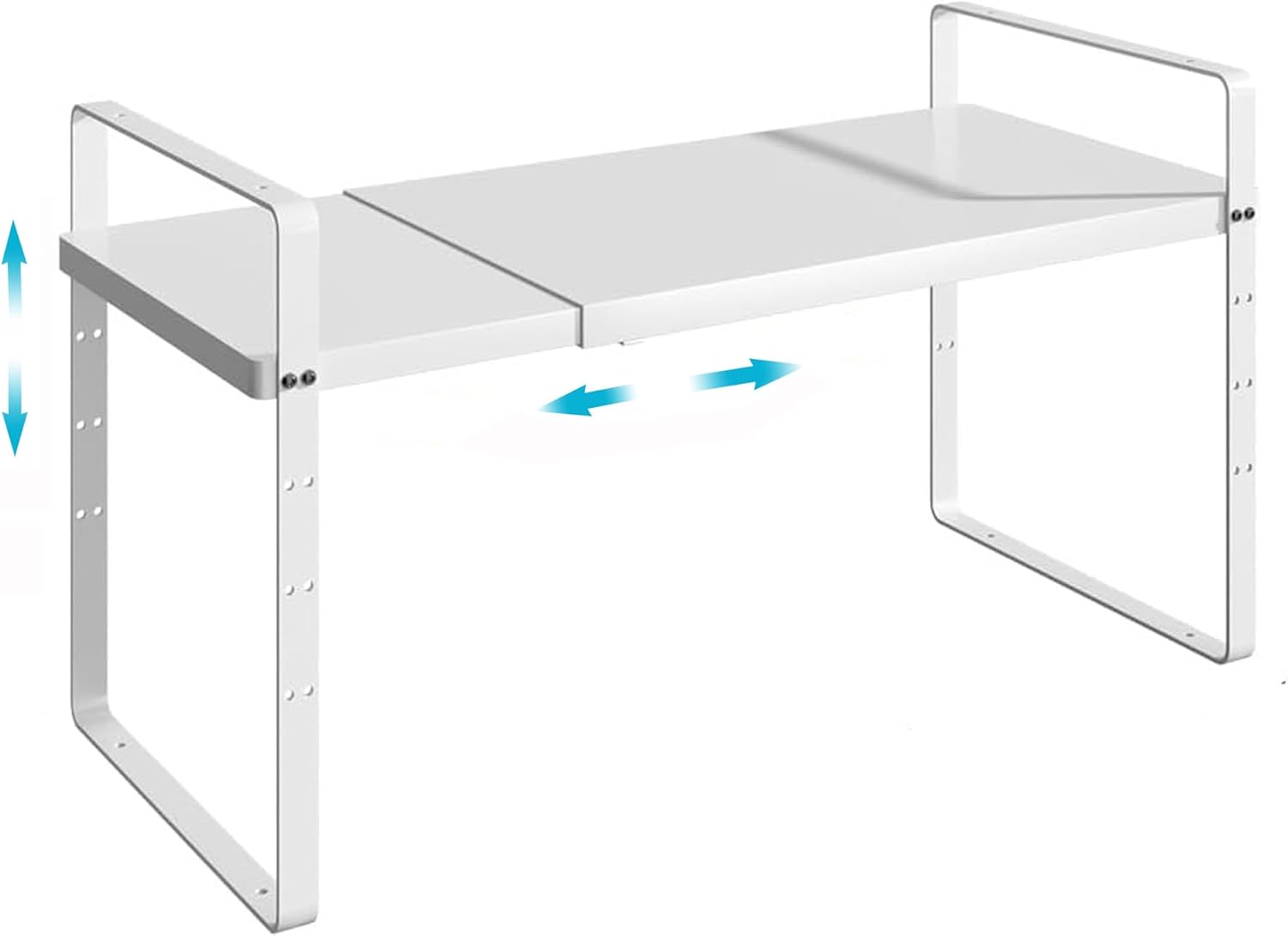 - 【Expandable and stackable design】--The Adjustable Countertop Organizer (collapsed) measures 16.7" L x 10.2" W x 9.8" H, expands from 16.7" to 27.2" length. You can also stack two shelves together to create a two-tier storage space.