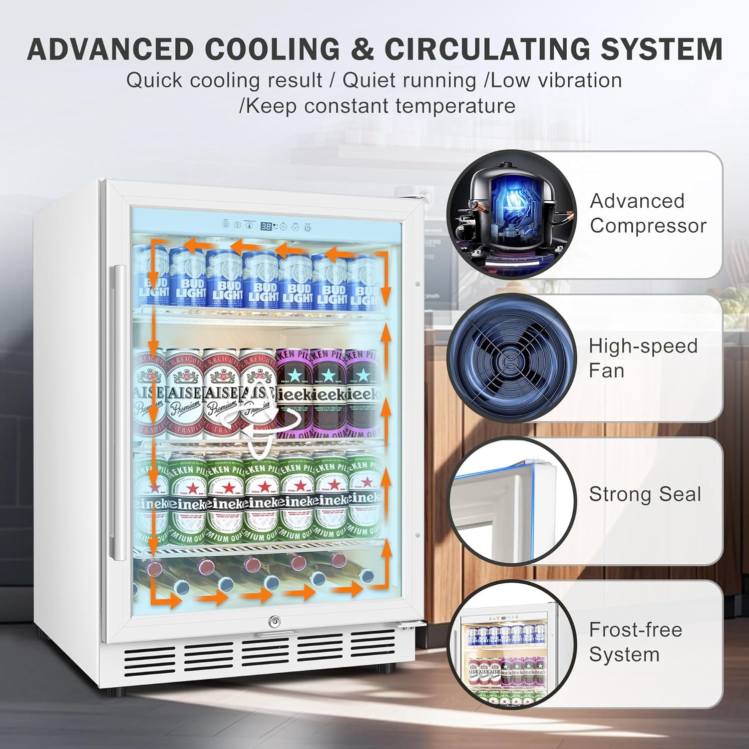 - Efficient Cooling System: Designed with an advanced cooling and circulating system, this fridge ensures quick cooling results. Its high-speed fan and strong seal maintain a constant temperature for optimal beverage preservation