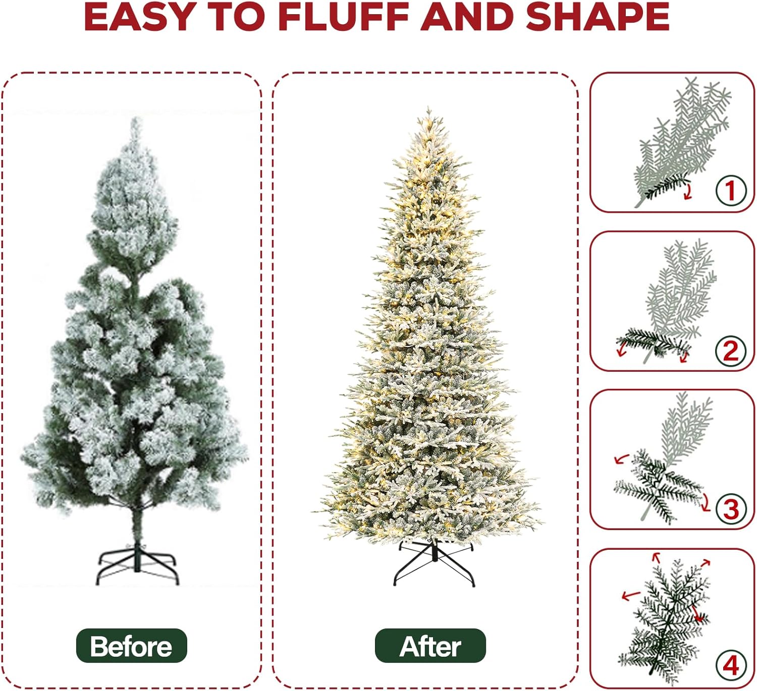 - NATURAL & Full LOOK: Measures 12 feet tall, 72 inches diameter at the base. Featuring snow sprinkled branch tips which creates a wintry feel, 8109 PE& PVC branch tips for a full and life-like look, this snow flocked Christmas tree can be easily fluffed and shaped for a splendid and natural display and also provides abundant space to showcase your favorite ornaments.