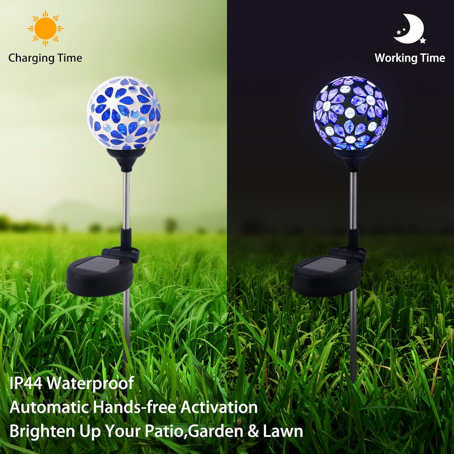 - 【CLASSIC MOSAIC PATTERN】---Outdoor Solar Lights are handmade with a classic pattern and perfect design, they can glow in the dark and the light will make your mood happy and light up your garden and yard!These solar mosaic glass ball stake lights add amazing color around your garden.
