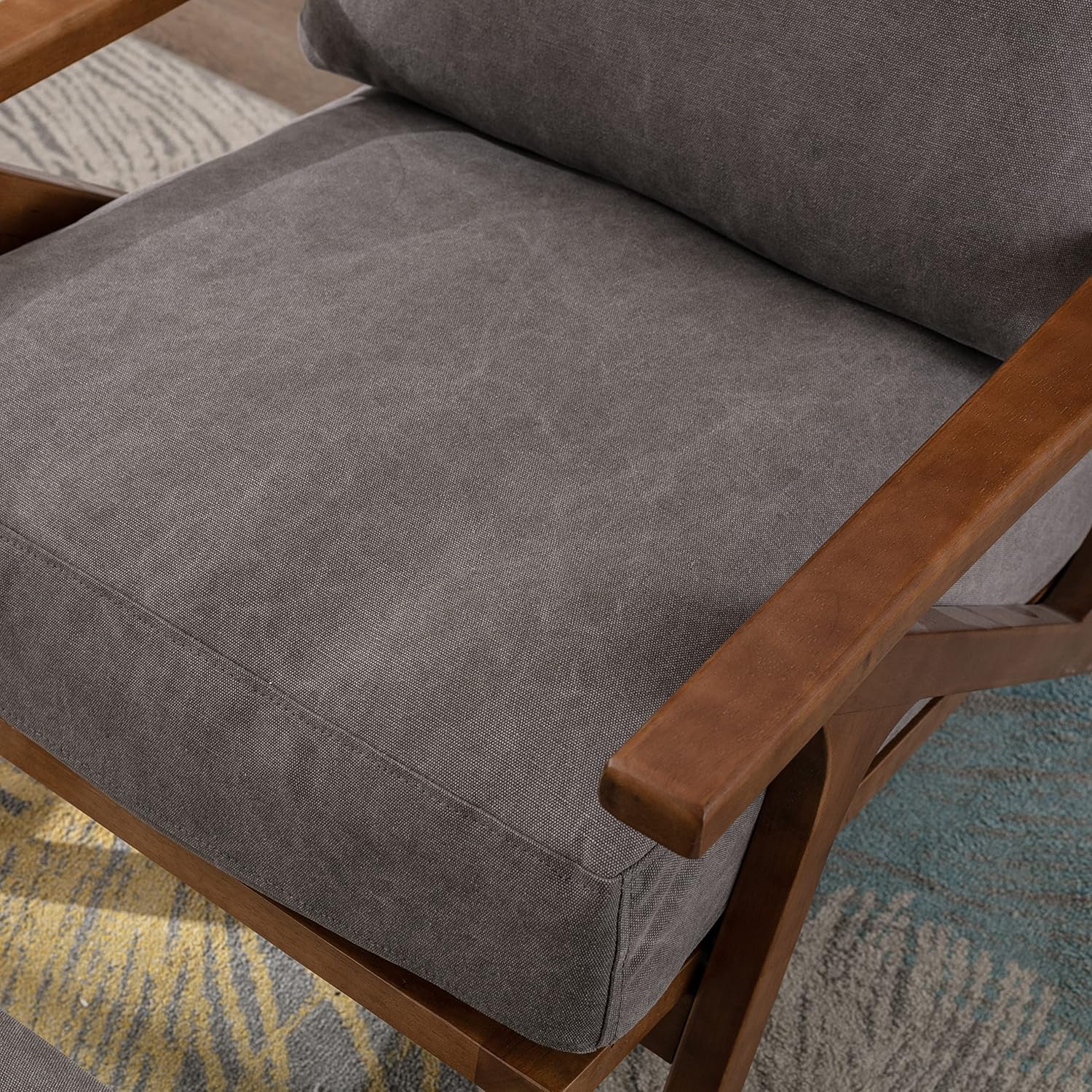 - Mid-century lounge chair, two super soft cushions are upholstered in denim fabric which is more breathable and durable than ordinary fabrics. Both backrest and seat cushions are REMOVABLE