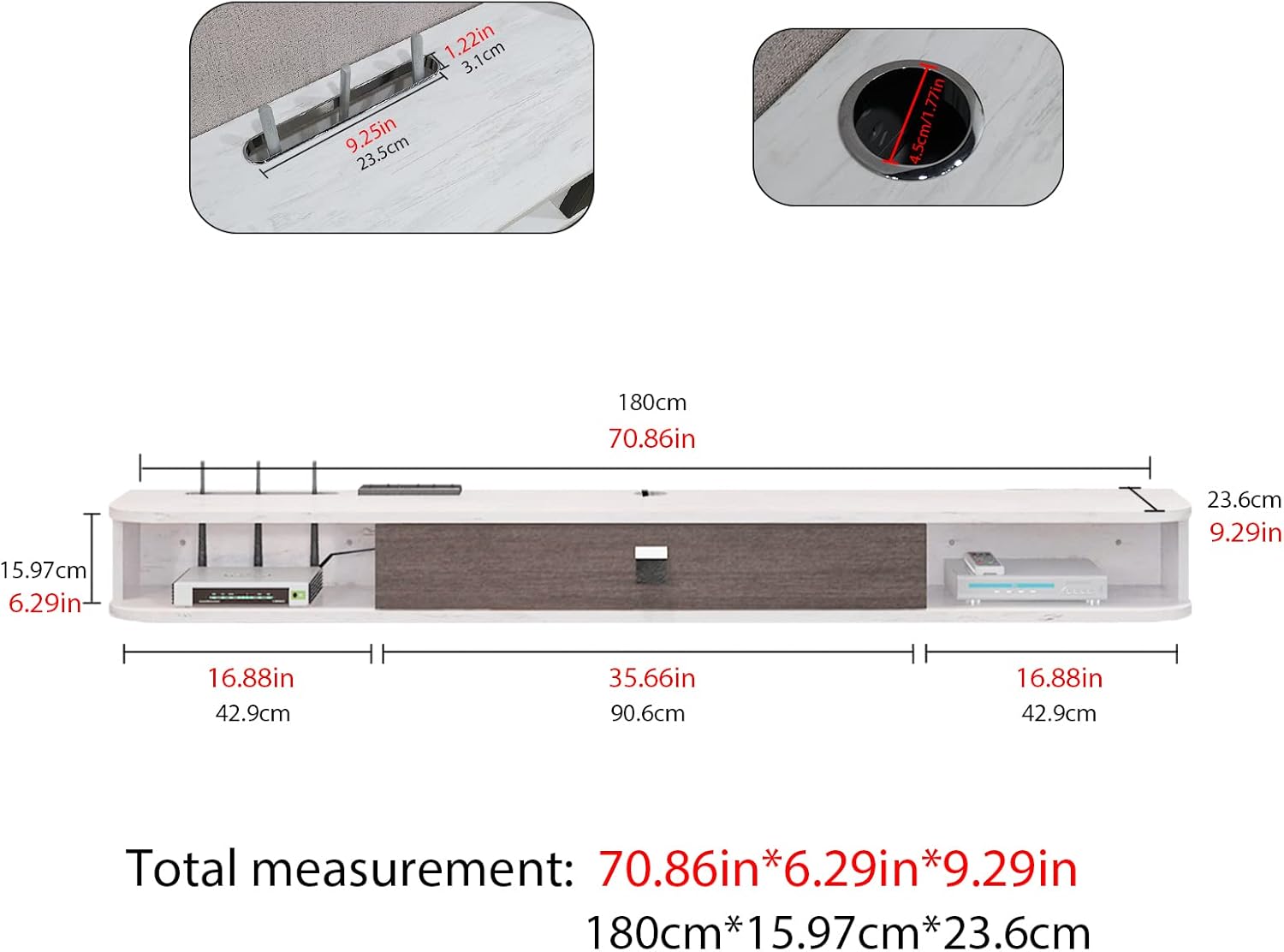 - 【Make your Room Tidy】Equipped with cable hole for hiding set-top box antenna, the floating tv console helps to keep all items in order and easy to get, and keep your items clean and tidy. Contemporary TV wall lamp with creative design is the perfect solution to save home space and optimize space usage.