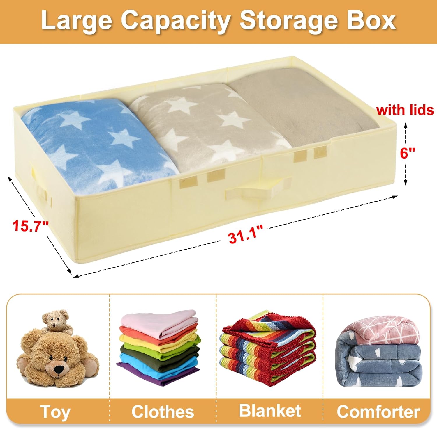 - STURDY STRUCTURE & STURDY HANDLES: 3 Reinforced sewn-in handles make it easy maneuverability and convenient for you to carry and pull out from under the bed; handy bins make excellent blanket organizers and storage; Lasts longer than underbed storage containers plastic; Keep your bedroom neat and tidy with storage bins with lids that fit your room's existing decor and theme