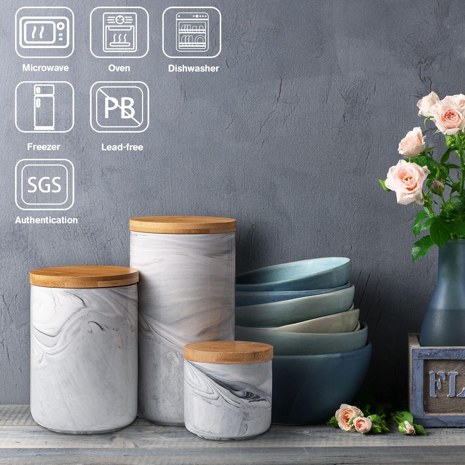 - [Airtight Ceramic Kitchen Canister]: Made of porcelain, lead-free, and lightproof.The silicone seal ring of the wood lid makes the white kitchen canister air-tight. To be sure they’re airtight, you’ll hear that satisfying “pop” when you open the sugar canister!