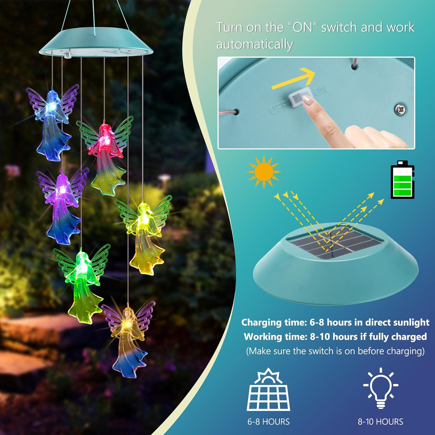 - 【Solar Powered Wind Chimes】 Featuring a unique design with 6 angel lights charge automatically in the daytime and light up at night, free your hands, new version solar panel absorbs energy quickly, the solar wind chimes lights can last up to 8-10 hours after fully charged.(Gift for Mom, Gifts for Grandma, Mom Gift, Grandma Gift, Birthday Gift for Mom, Birthday Gift for Grandma)