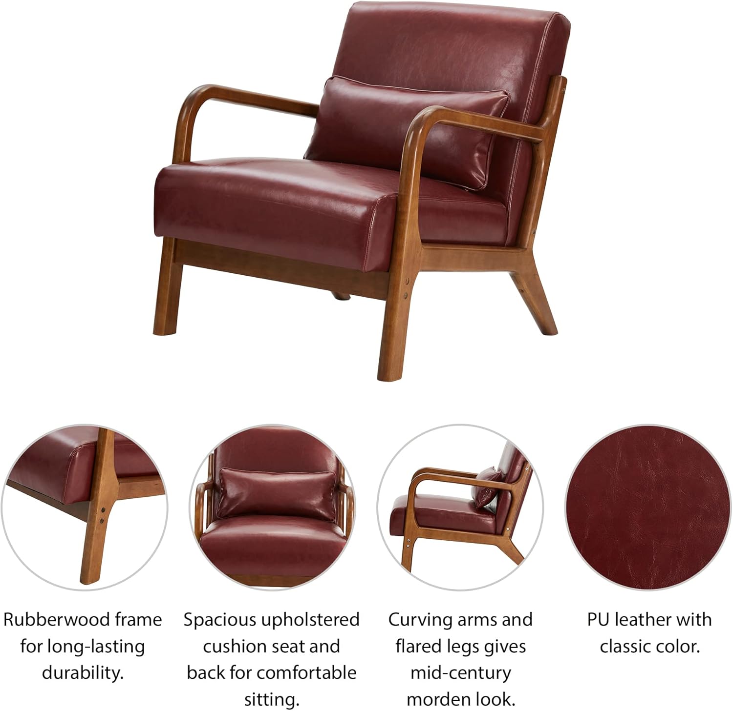 - Design: This vintage-look PU leather armchair is designed with a solid wood frame bringing the mid-century modern style to your home. Also the walnut color frame of this small space chair fits the solemn elegance of your room