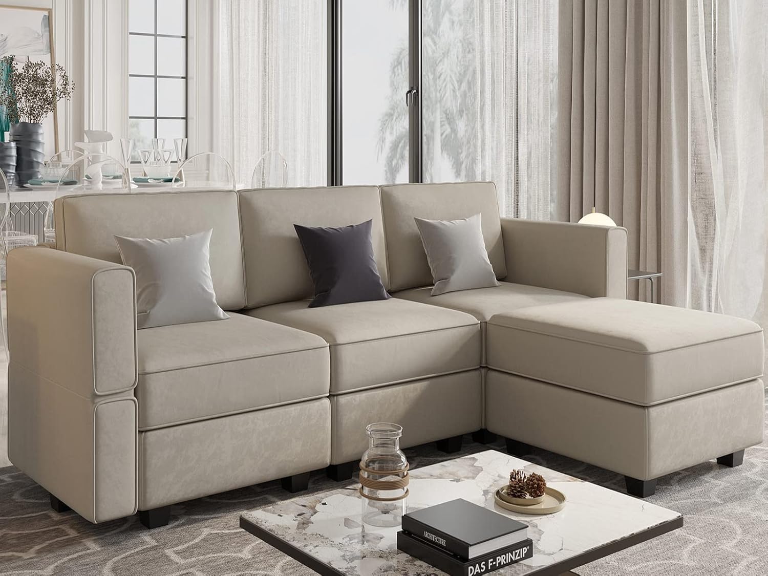 - Combination of Function and artistry: The modular sectional sofa demonstrating your unique taste of style, which is a perfect combination of fashion and function. It deliveries the deep comfort and distinct individual style, which is the charm of Belffin modular sectional sofa.