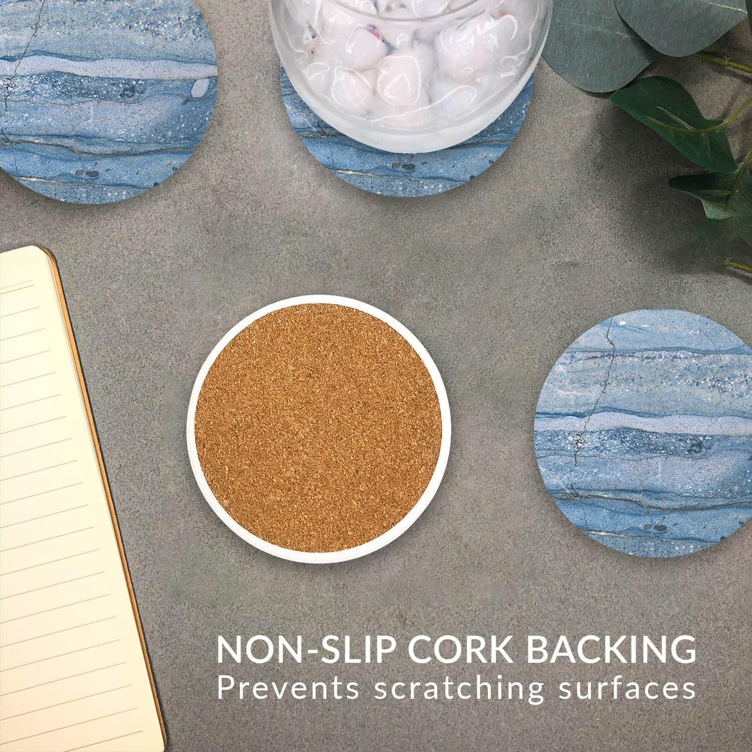 - FULL COMPREHENSIVE PROTECTION – The stone coasters feature non-slip durable cork backing to protect countertops and desks from scratches even from thirsty drinkers! The non-sticky corked backing base helps the coasters stay in place and prevents scratching your glass or wooden countertop tables.