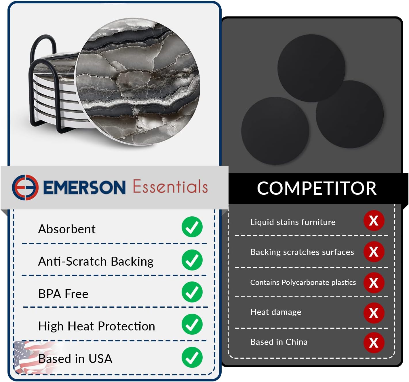 - ✅ ABSORBENT – Our moisture absorbing coasters are great for wine, tea, are stain resistant and scratch proof. Complement your coffee table with our iron stand and modern coasters that are thick enough to absorb water, liquid, moisture, yet thin enough to blend in perfectly with your decor. The coaster set combines the great marble stone style design with fast liquid absorbency for drinks.