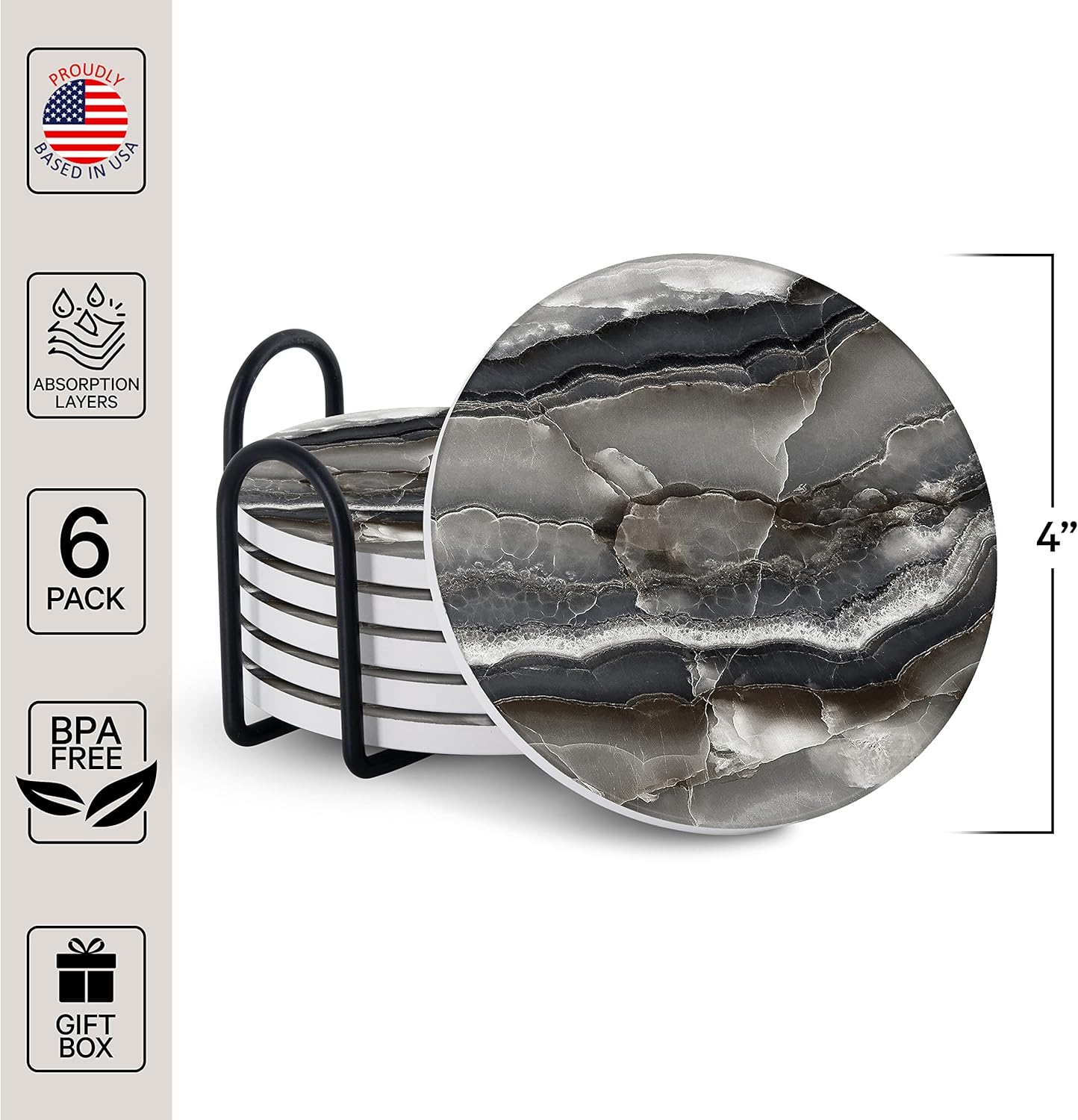 - ✅ VALUE 6 PACK – Our coaster set includes 6 round ceramic stone coasters, 1 modern metal stand that can neatly stack your coasters, and a well packaged cute gift box to ensure no chips. The diameter is 4 inches making it perfect for wood and coffee tables, glass table tops and desks. The material absorbs condensation within seconds without leaving stains, water rings or stickiness.