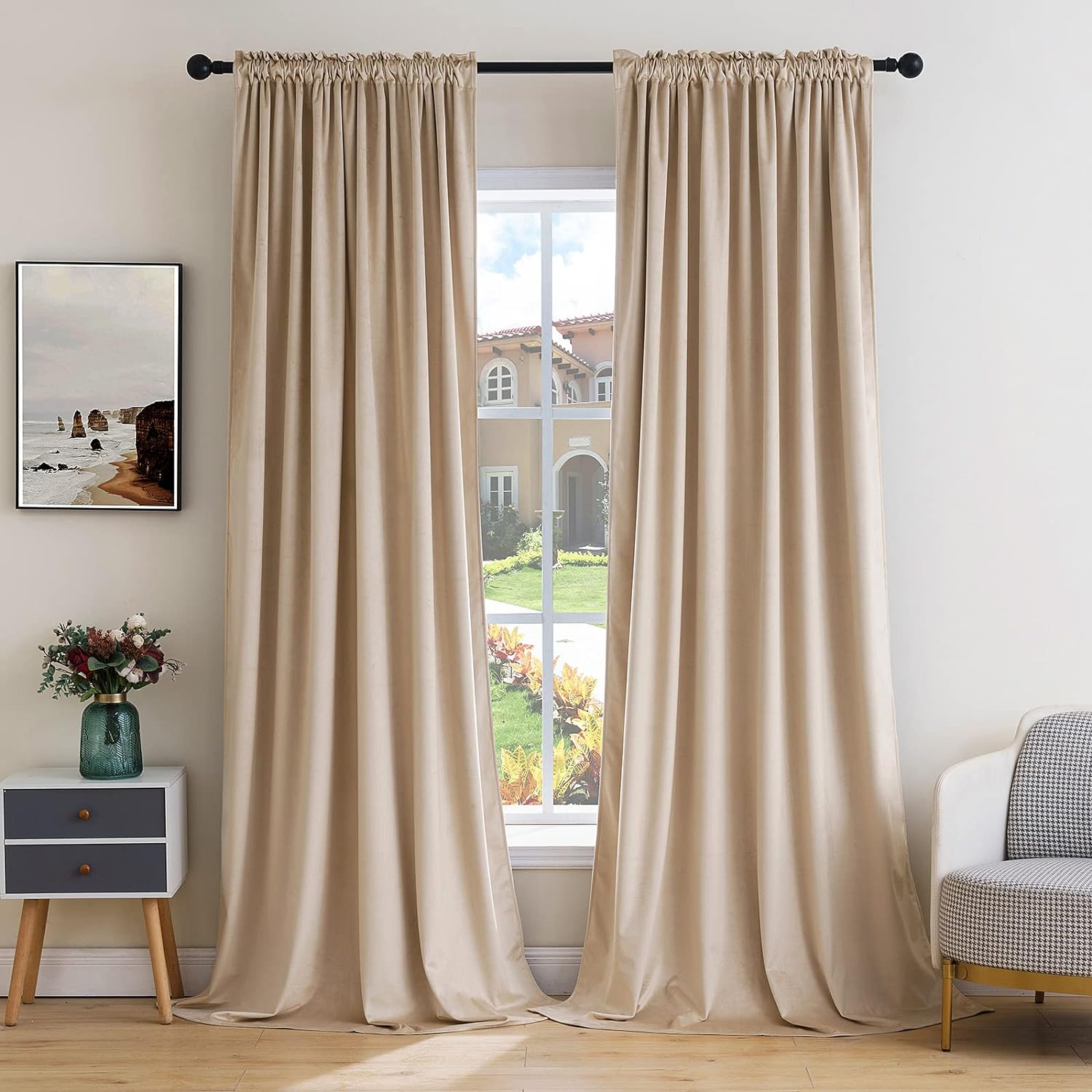 MIULEE Camel Beige Velvet Curtains Thermal Insulated Blackout Curtain Drapes for Bedroom Living Room Darkening 96 Inches Long Curtains Panels Rod Pocket Set of 2