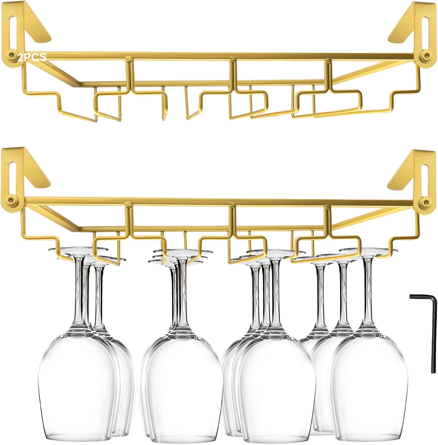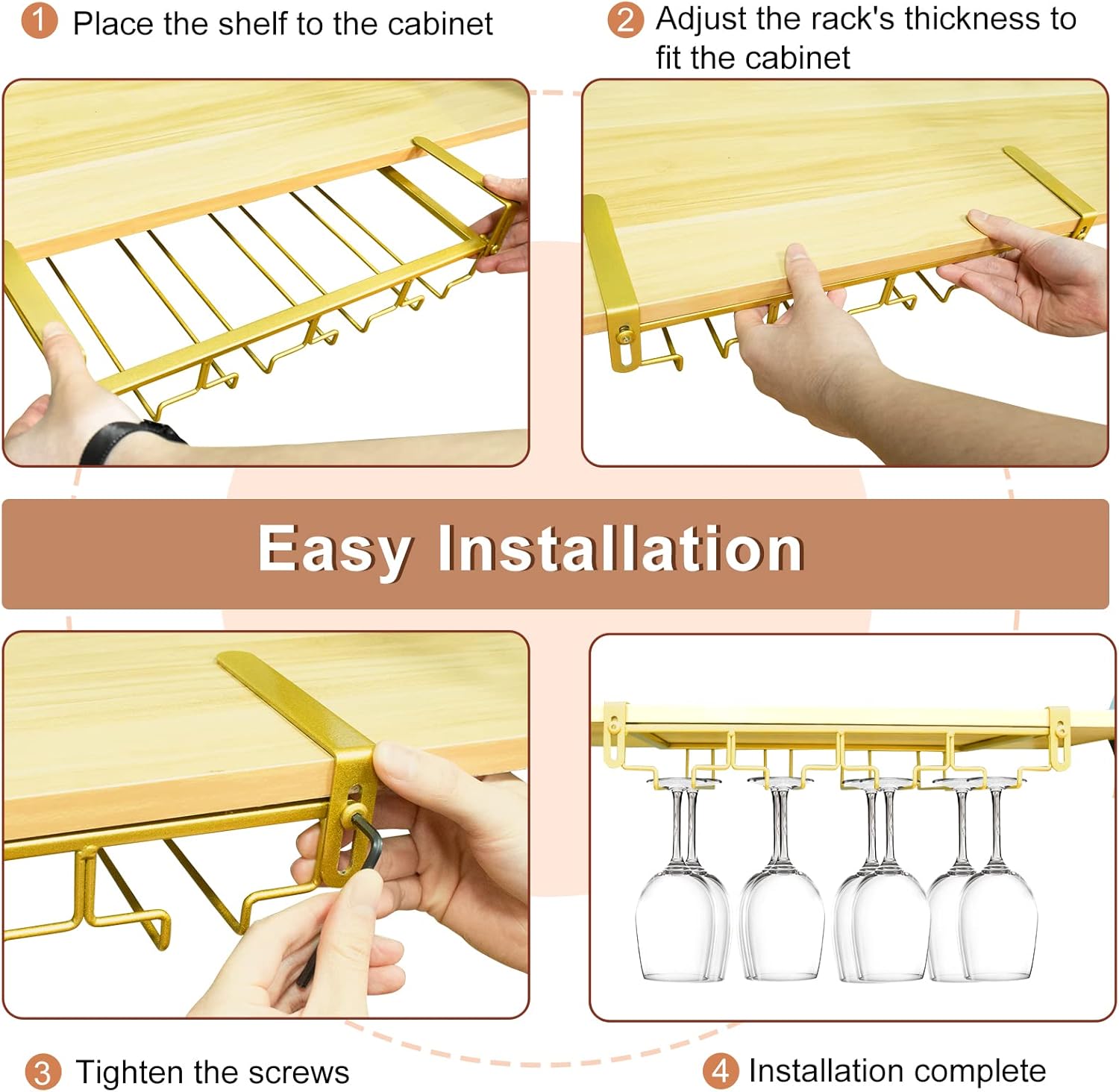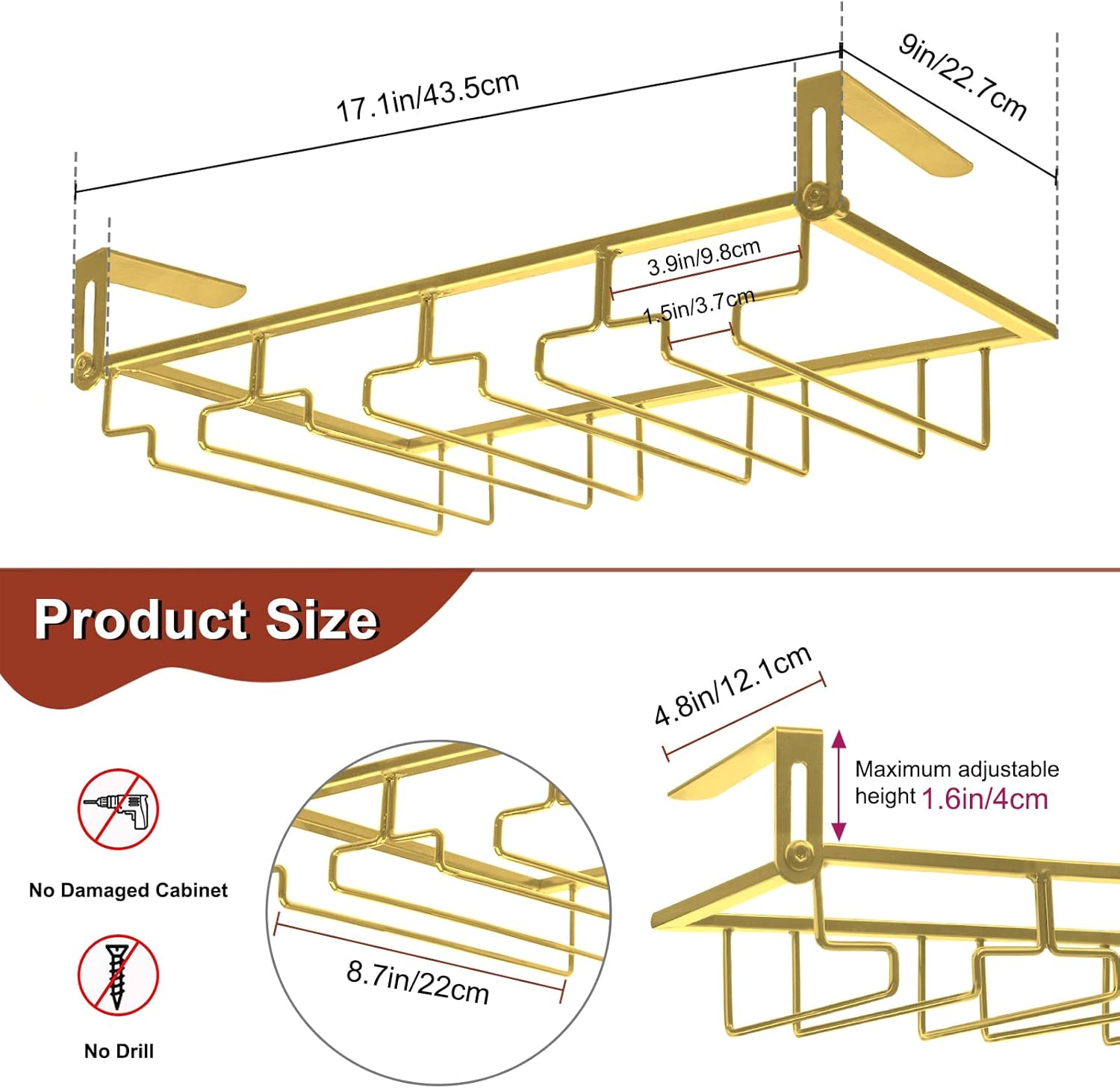 AUHOKY Adjustable Wine Glass Holder Under Shelf, Nail Free Metal Stemware Holder Storage Hanger, Hanging Wine Glasses Rack Organizer Under Cabinet Mount for Bar Kitchen (4 Rows, Gold)